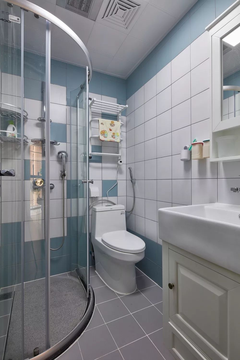 蓝白搭配的墙砖,灰色的地砖,米色的收纳柜,镜柜、还有弧形玻璃门隔断,布局较紧凑,保证了日常基本需求。