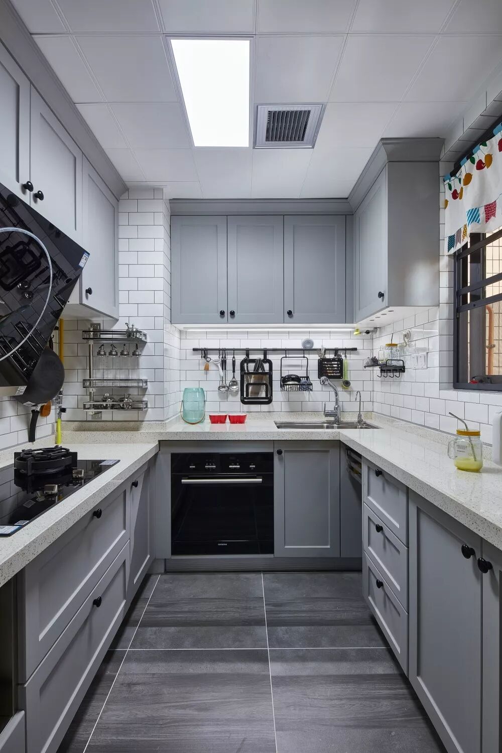 蓝色橱柜配上白色工字型墙砖,清新又大方。U型布局,分区清晰,操作方便。