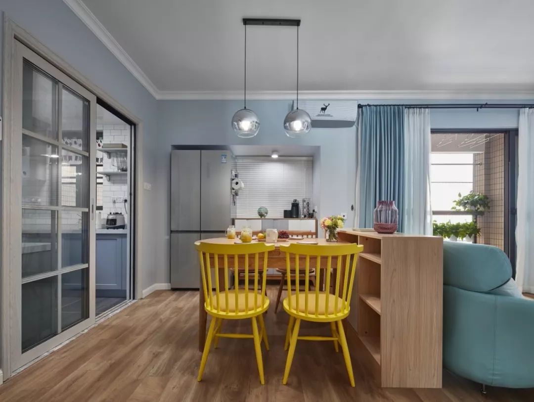 餐厅和客厅之间,用了一个原木柜做隔断。搭配两把黄色小椅子,整个空间都被点亮了。