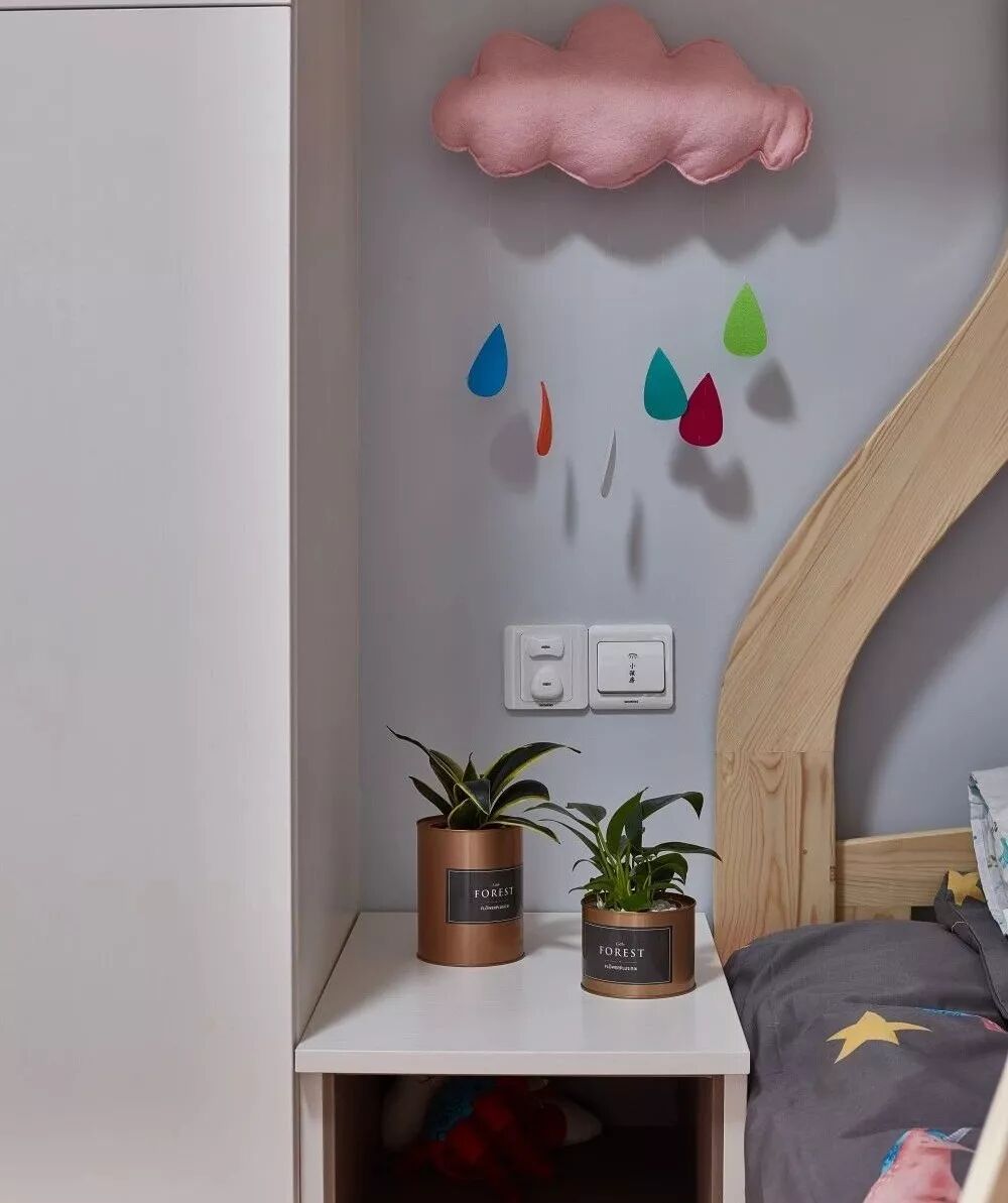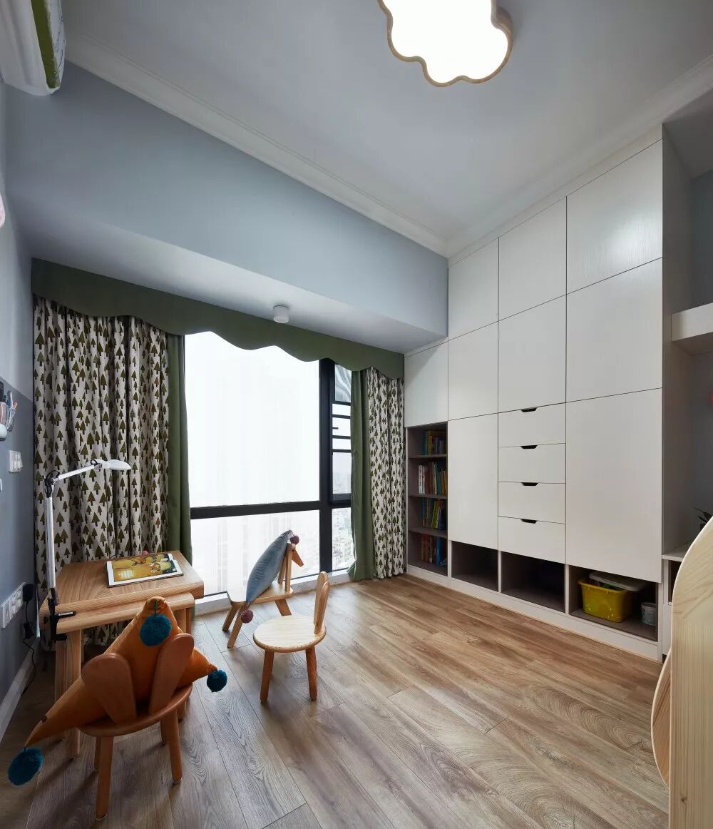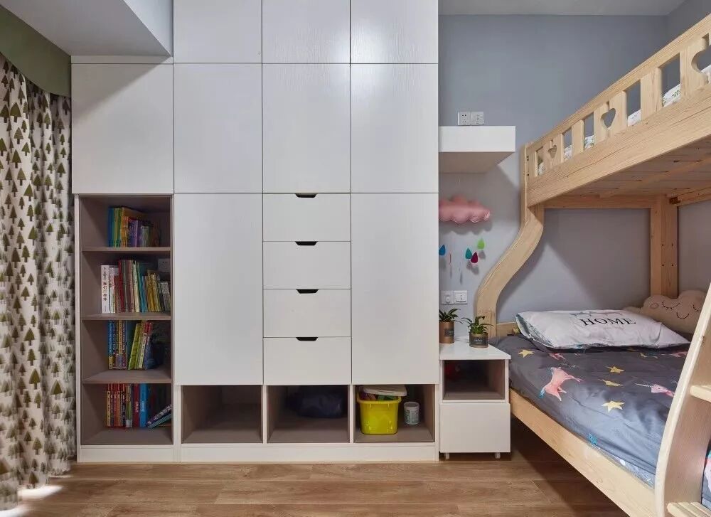 儿童房是上下铺设计,沿着墙壁打造了多功能柜,可以存衣,也可以放书。尤其书架这个高度,正好孩子够得着。