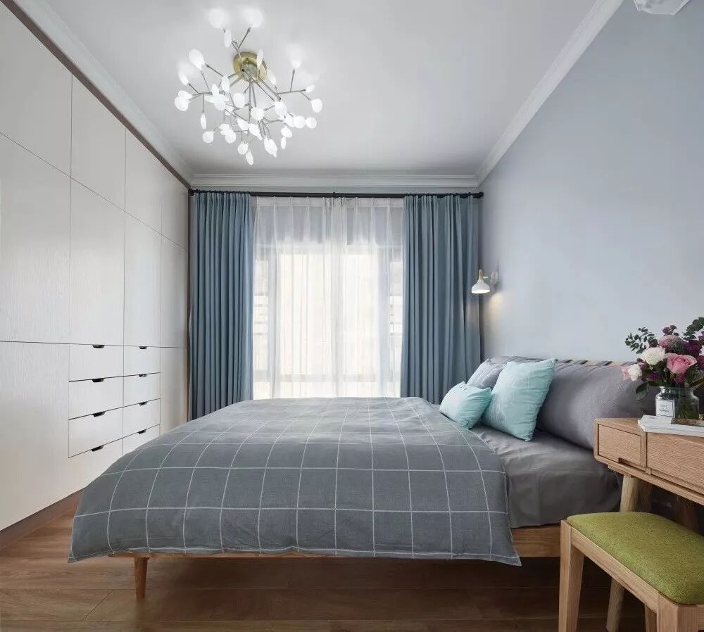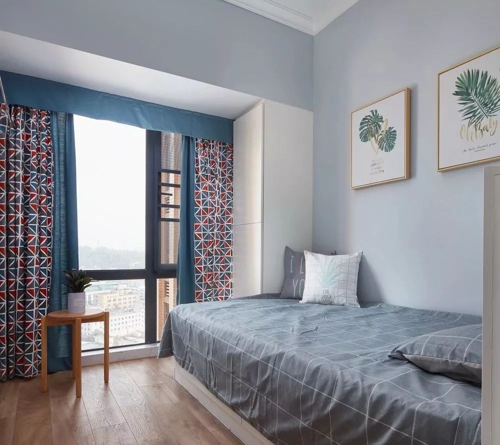 沿着背景墙打造了一面嵌入式的大柜子,上下两端储物。碎花窗帘的融入,让屋子温馨了不少。