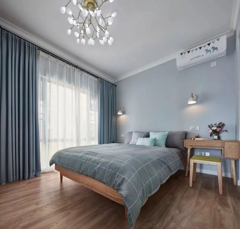 木地板浓浓的大自然气息,浅蓝背景墙,纯白大衣柜,清新就是这么简单。