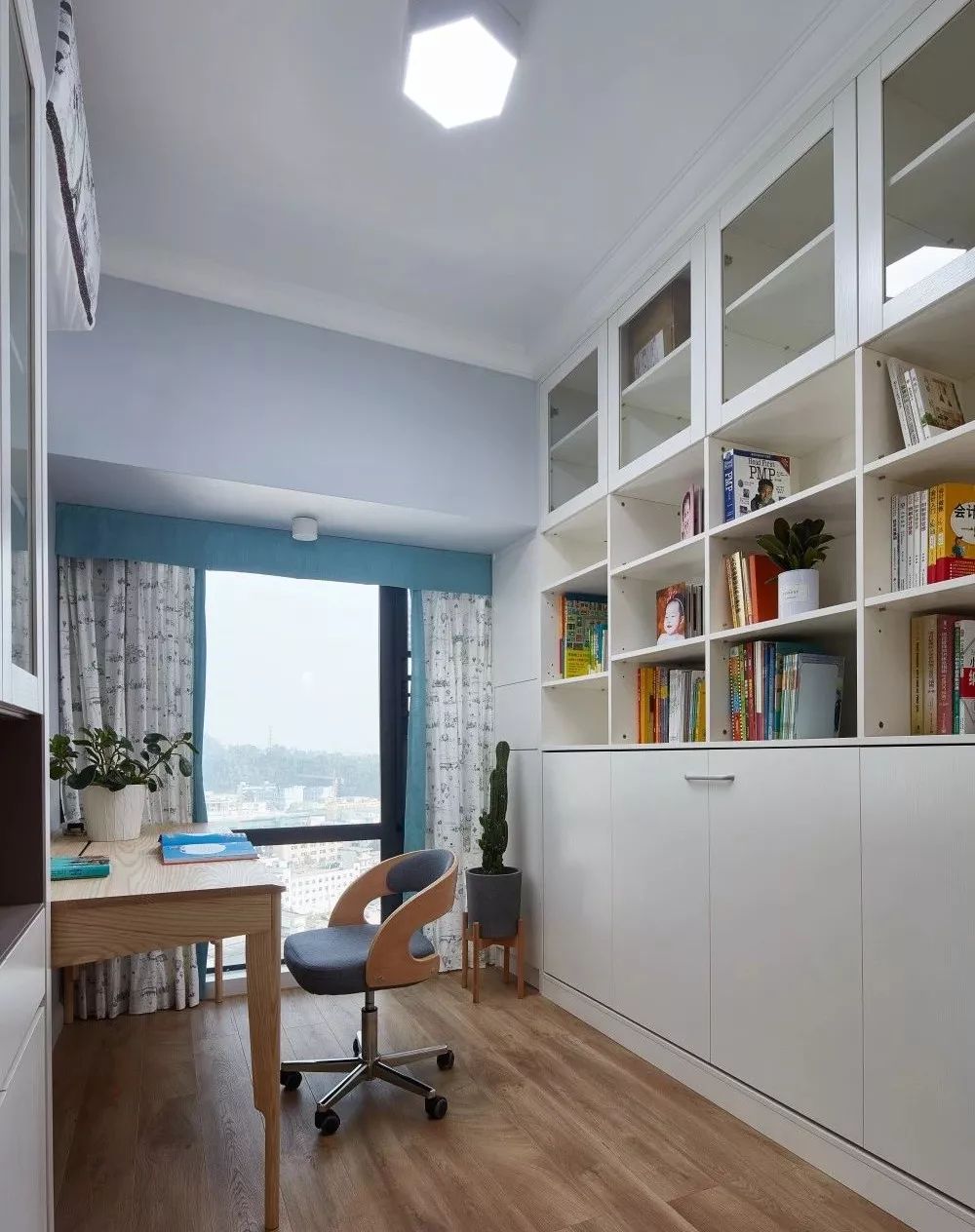 客厅的右手边就是书房,用玻璃推拉门做了隔断。里面有个大大的落地窗,视野还蛮开阔的。喜欢这样的布局和搭配,让人觉得很舒服。