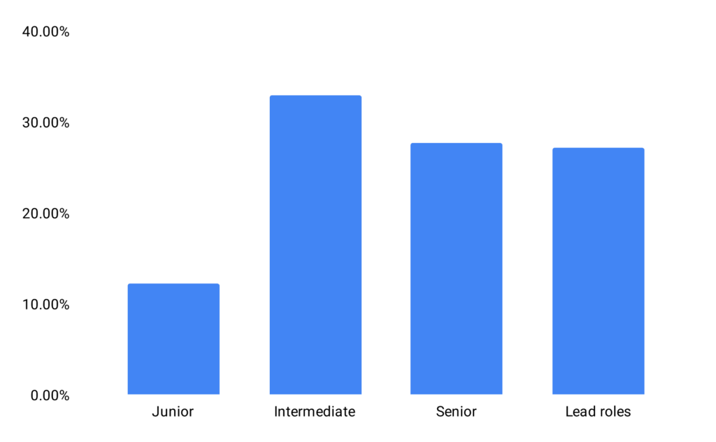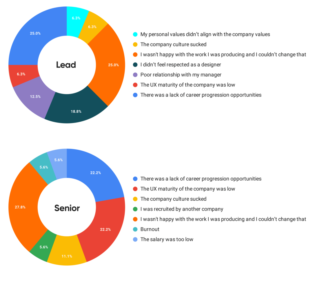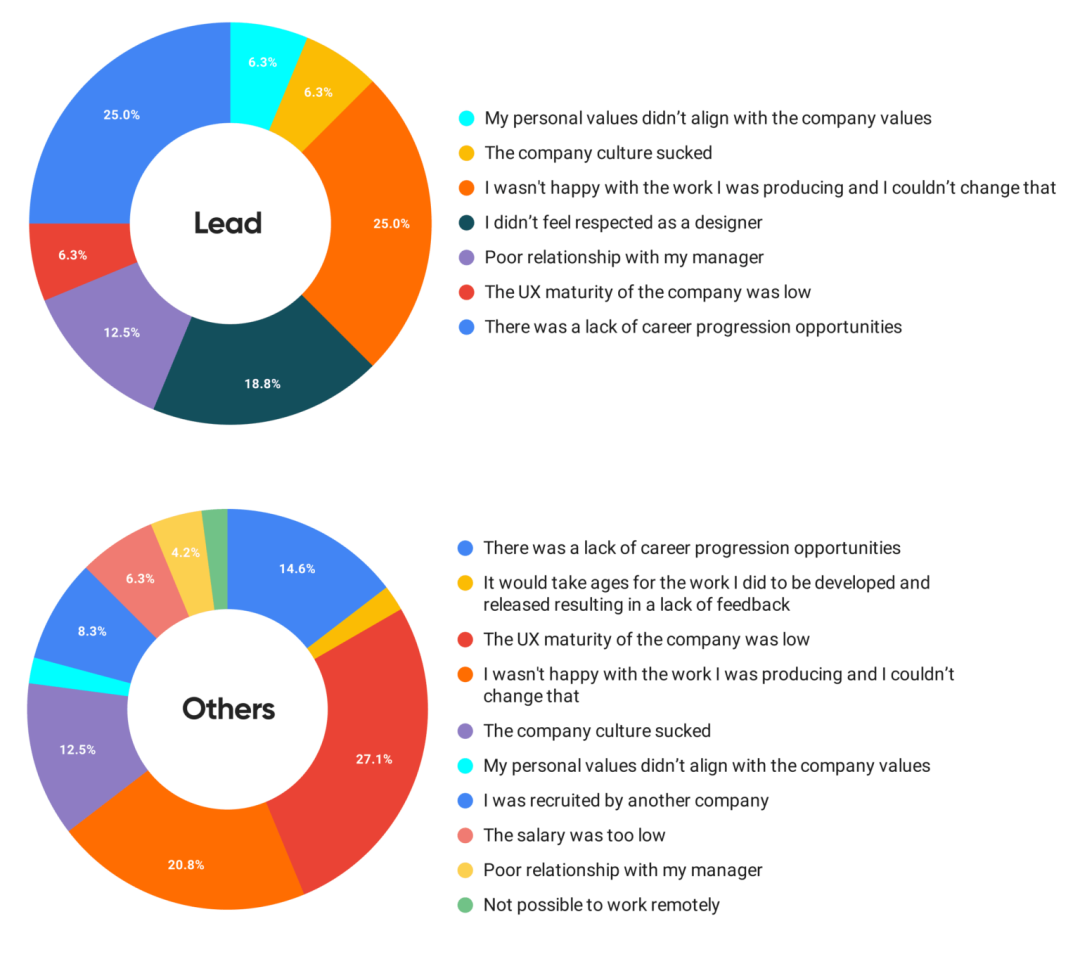 缺乏职业的上升空间大概有 18.5% 的设计师选择了这个答案,这并不令人惊讶,同时它也符合不同阶段和资历的特征,正如同我们从这些图表当中看到的,位于领导地位的设计管理者当中 25% 的人因此离职,而高级设计师当中则为 22%,越往上走,上升空间越小,这非常合理。比如,通常一家公司只会有一个设计主管。