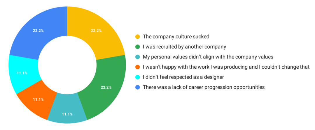 在这份调研当中,被采访者只能从诸多选项当中选取一个答案。我当然很清楚,促使设计师离职的原因通常是多方面的,但是我想透过这份调研,知道最紧迫、最主要的离职原因。