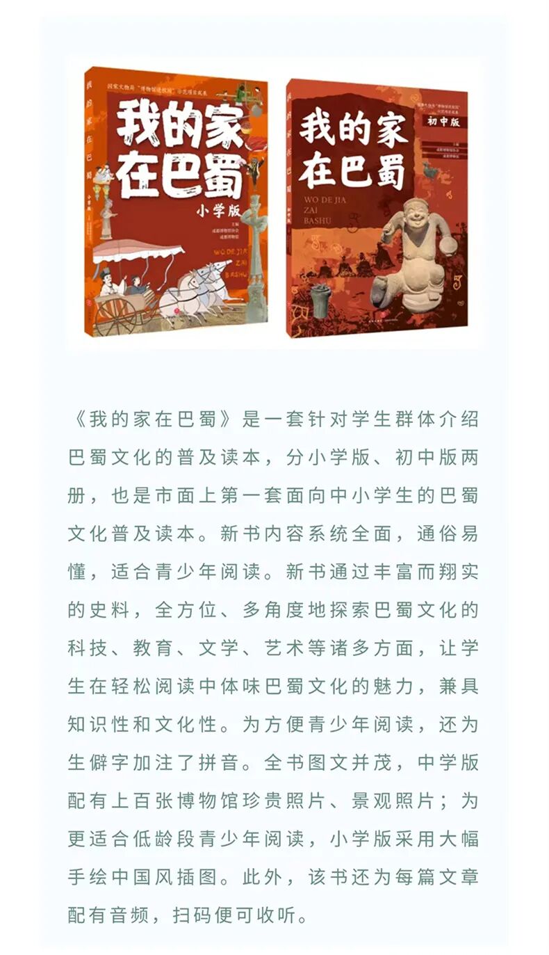 成都博物馆协会与成都博物馆共同牵头,联合四川博物院、重庆中国三峡博物馆等川渝两地近20家文博单位,以及成都七中育才学校、成都市回民小学等多所成都市中小学校,共同推进实施“巴蜀文化进校园示范项目”,编撰出版了面向中小学生的巴蜀文化普及读本《我的家在巴蜀》。这是市面上第一套面向中小学生介绍巴蜀文化的普及读本。