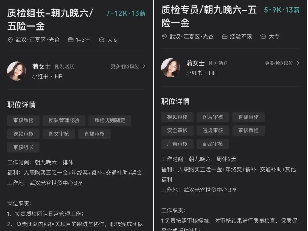 在boss直聘上,观察到小红书审核专员的工资不过5-9k,且公司地址是在武汉,并非小红书上海总部。
