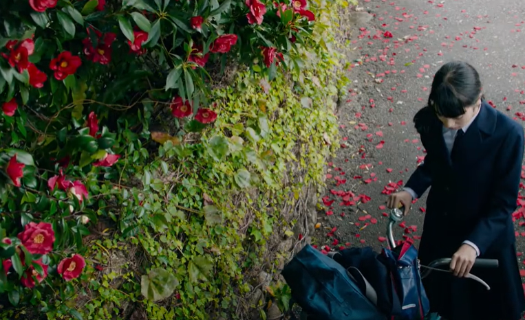在这一帧中,红色的山茶花和落寞的夏芽被分在不同的角落。而大友山茶花样的甜蜜、炙热也无法打动沉浸在过去回忆中的夏芽。