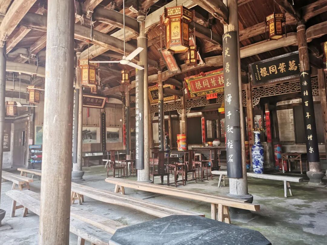 继续向西入“光宗门”和“耀祖门”二门,可见堂屋与戏台东西对望;从祠堂望向戏台的透视方向形成框景。据村民介绍,宗祠日常仅开两侧门,每年二月二祭祖才敞开中央大门,连通门后的戏台。堂室前檐完全开敞,深处置一堵太师壁,壁前一条桌、两太师椅、若干长条凳。夏日的午后,一些村民会来到阴凉的堂中选一条长木凳躺下消食小憩,听些乱弹小曲(一种地方曲艺形式),用蒲扇驱赶蝇蚊。