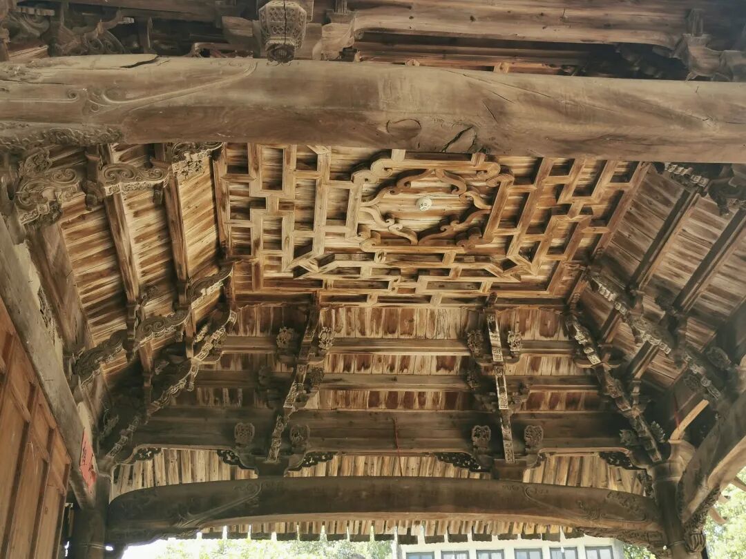 放眼整个村落,所用材料无非原木、蛮石、少量砖和白灰。木石都基本保留其天然的本性,率真自由,活泼灵动,弯的就是弯的,糙的就是糙的,但艺术处理依旧是雅致的。走到戏台附近便可窥探藏在藻井中的精巧雕琢。