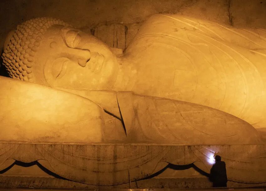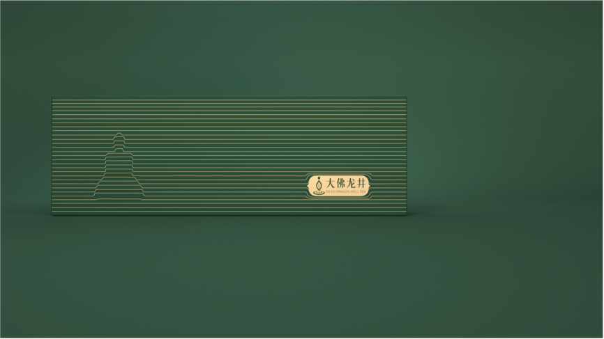 “‘大佛龙井’名字中的‘佛’字确实有迹可循,在《新昌茶经》中记载了三位很著名的僧人。设计缘起品茶中的一霎五感,一条静谧而自然的直线,由茶而心动,为茶而盘坐,因茶而开悟。一条线,是和茶平行的线,有波动而又波澜不惊,这就是一条饮茶的心态。茶,在眼,在心;茶是一条时间的线,一条开悟的线。而线就是大佛龙井。作品中用线的变化组合形成抽象的佛像,简洁而又深意。”