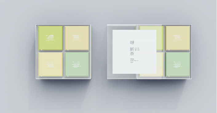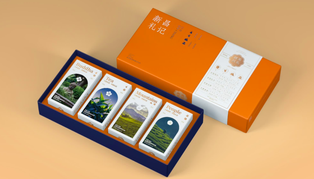 “新昌礼记系列包装,是以城市礼物作为切入点,打造系列包装,通过挖掘新昌的人文背景与茶叶品质,提炼出“佛”、“茶”、“山”、“人”四个理念为核心卖点,巧妙结合不同口味的茶叶产品,形成“四茶以礼”的组合构成,打出属于新昌自己的城市组合拳。产品整体采用抽拉盒的包装结构来体现,外带腰封,内置单盒,城市礼物仪式感拉满。整体包装定位简洁、精致、大方、热情,可以较好体现出新昌这座茶叶之城的魅力与待客之道。”