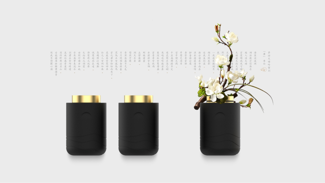 “借由诗仙李白《梦游天姥吟留别》诗作,给世人与天姥山留下的宝贵文化财富和深刻的视听美学体验,融合于设计作品之中。陶瓷罐装以器言诗,是‘半壁见海日,空中闻天鸡’的写照,留白处,皆是诗,以此传达一种中式空灵之美,将唐诗文化、茶道文化、天姥山元素与产品美学结合,简约雅致,是茶事、也是美事。”