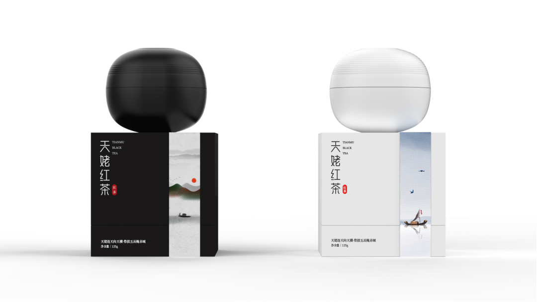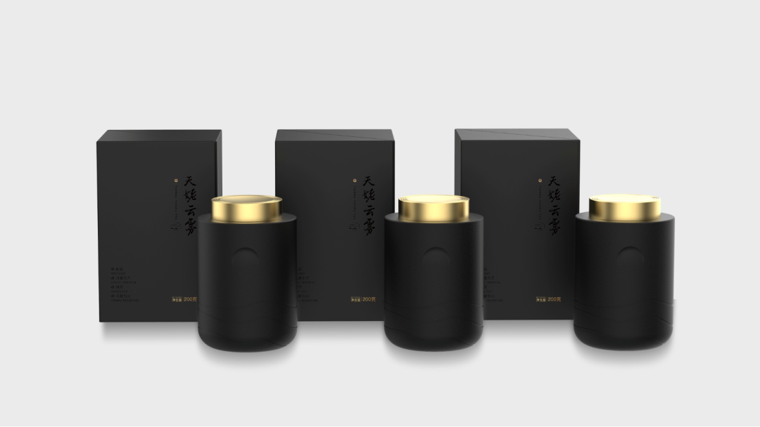 “设计源于茶名‘天姥云雾’,天姥山以‘云海’著称,两款礼盒的外观分别采用‘等高线’和‘泼墨山水’。一个现代,一个古风,用两种截然不同的风格来演绎‘山海云雾’的主题。天姥山有穿岩十九峰,盒中的茶罐即为山峰的造型,多种颜色的设计代表了不同季节里天姥山的气象万千。打开盒盖,白色硫酸纸之下,19个茶罐如同19座山峰,时隐时现,令人沉醉。”