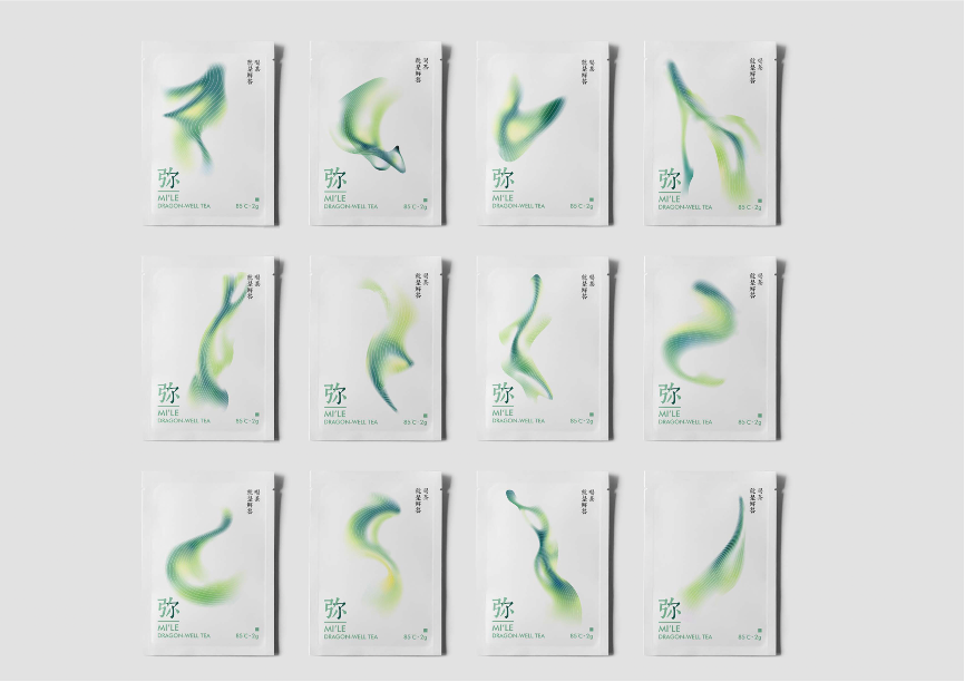 “茶舞——大佛龙井茶叶落下时的优美轨迹,设计通过延时摄影记录龙井茶叶落下的过程,用渐变绿和流线的重塑方式,让每个包装都独一无二,三分形象,七分想象,给人以更多的联想空间。取自大佛弥勒的产品名“弥了”,同“茶舞”小包结合,配合上“半透明”的包装,营造出杯中舞的交互氛围,传递以放松、沉淀、解忧的体验感受。”