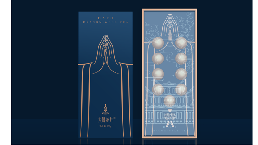 “此设计以布袋和尚(弥勒佛在民间的化身)为原型,将其欢喜神情与自在姿态以抽象化的色块进行呈现,巧妙地表现禅茶一味的奥妙。让品茗者在品大佛龙井中沟通自性与佛性,从而心生欢喜,得悟自在,真正感受‘居深山,心自在’的品牌文化。”