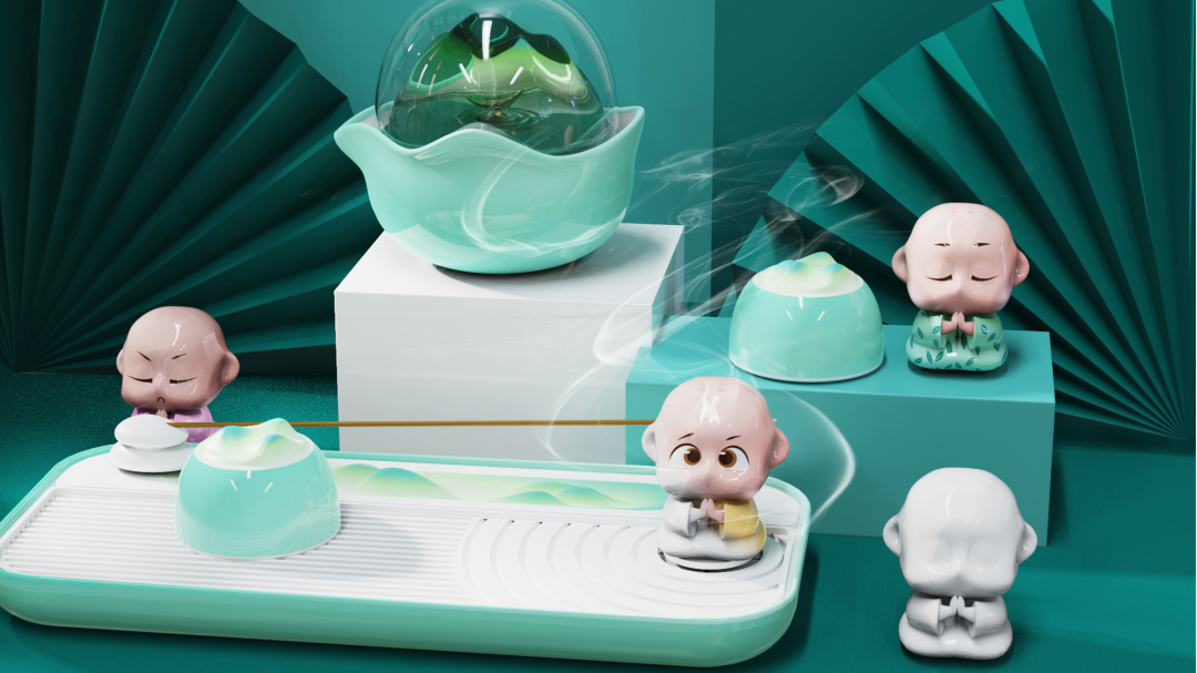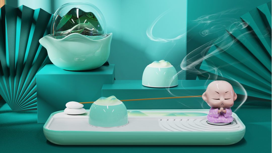 “为新昌文化创造一款盲盒属性快客杯产品套装,开发现代青年受众市场传播新昌文化。快客杯套装以新昌佛禅文化与山水景观为设计灵感,整体主题依据佛学“看山”境界,结合新昌山水云雾缭绕等自然景观,在产品外观设计上针对年轻消费人群审美倾向,以流线造型以及玻璃陶瓷结合材质,整体风格现代简约,萌趣可爱,套装内搭配随机配色涂装茶宠,可遇热变色,增加开盲盒仪式感与交互趣味性,最后茶盘产品结合香承与倒流香功能,套装整体使用可组成别致景观,增加产品套装整体性。”