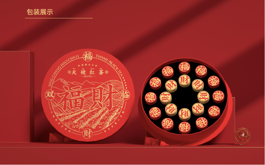“为新昌天姥红茶礼盒设计(含外盒与内盒)的出发点在于解决茶叶包装过度包装的问题。作为礼品用茶叶,包装费用昂贵一直是被人诟病的。为了解决这个问题,我们将包装盒设计成为装饰品,让包装盒可以二次利用,从而变相降低成本。设计风格上则选择了符合中国传统节日气氛的设计。”