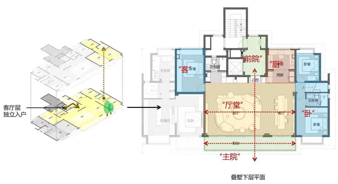 独立入户的半开敞梯厅成为住宅的前院,“前院—厅堂—主院”形成中轴空间,左右两厢为卧室区和客卧区;空间既有传统宅院的秩序感,又有现代生活的流动性。