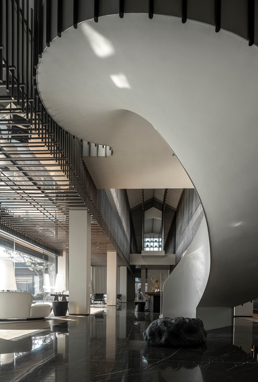 室内借鉴传统的造园手法,利用通高和楼梯形成了竖向的“游弋”,抬高、矮墙、虚隔、造景、汀步、对望,打造具有中式气韵的空间场景。