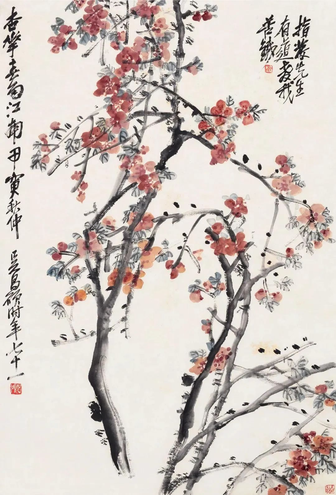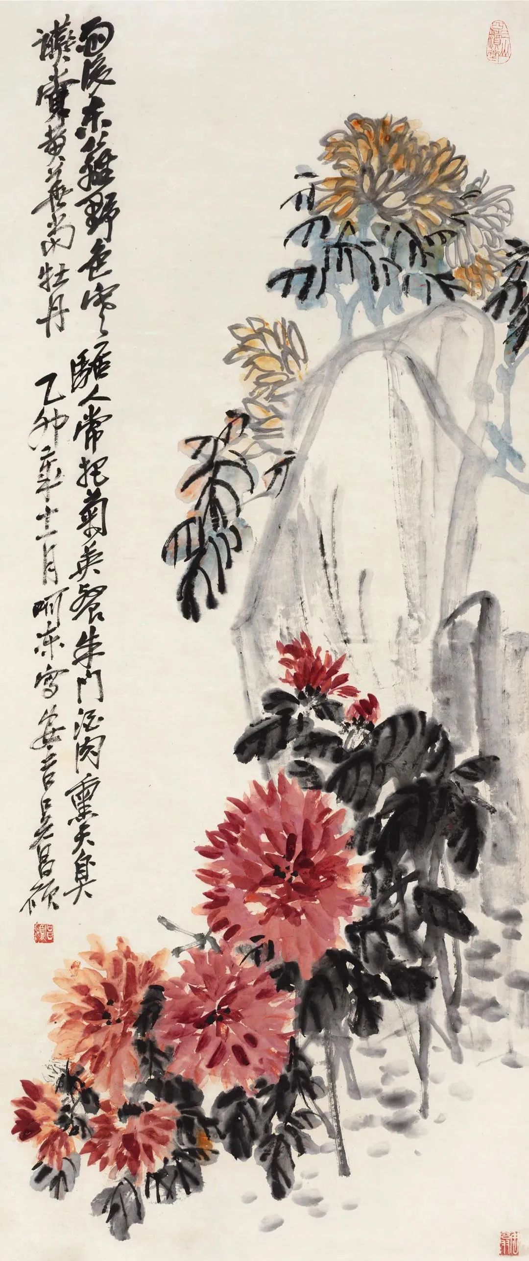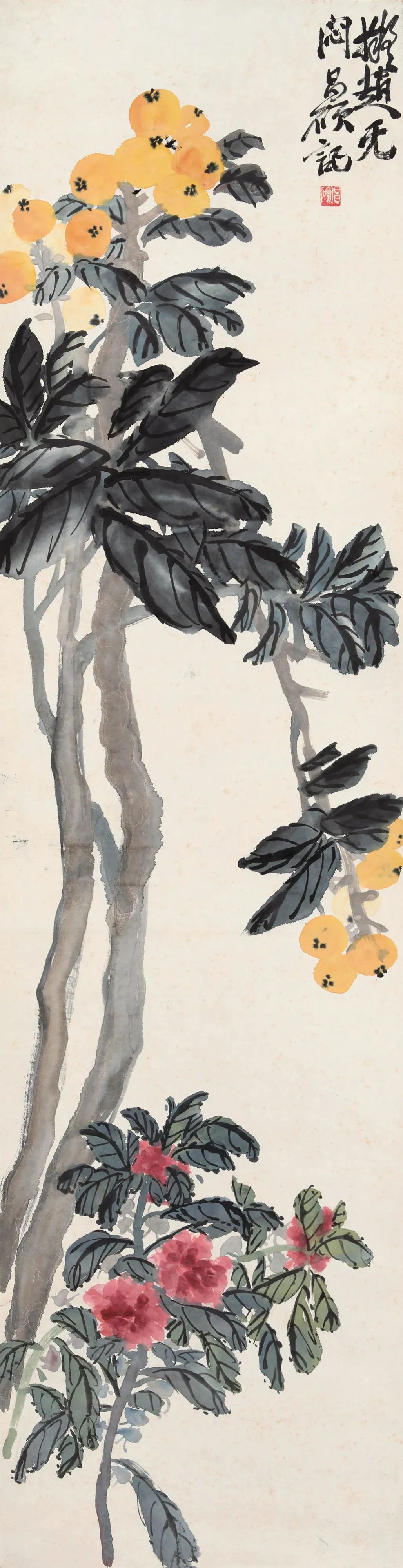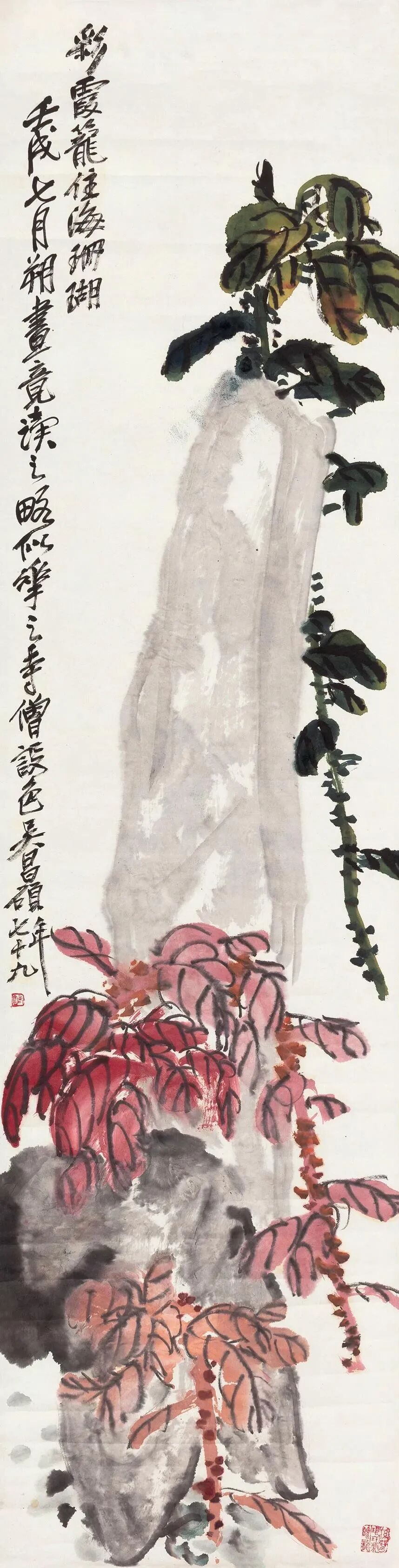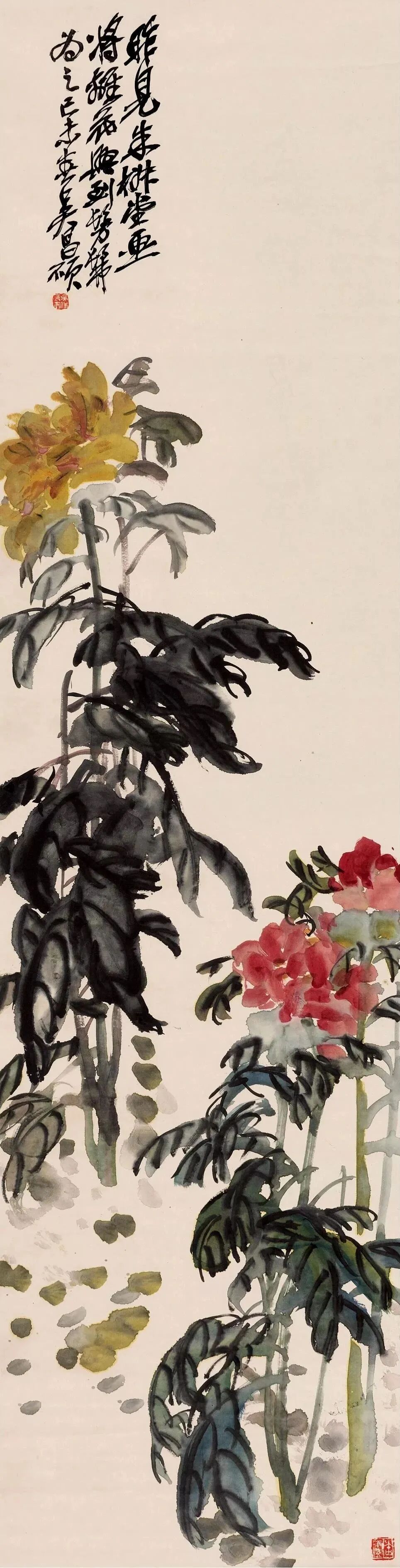 作品集2023-05-27 吴昌硕的花鸟画,笔法老辣! 吴昌硕 茅檐风色 此《茅檐风色》缶翁以熔篆草于一炉的老辣笔法入画,藤蔓错杂纠缠如龙蛇疾走,完全是在书写的状态中完成,配合着墨与色的枯湿浓淡,一气呵成。 吴昌硕 篱菊图 此幅《篱菊图》,用笔老辣,设色俏丽鲜艳,两相互补,相得益彰,可谓神品。 吴昌硕 真龙 这幅《真龙》将严谨感与率意性结合起来,融合各种画法,既得徐渭笔意,又不失个人风格,乃为吴昌硕晚年佳作。 吴昌硕 珊瑚枝 此幅《珊瑚枝》画于1924年,此时吴昌硕已81岁高龄。吴昌硕将梅花比喻成“珊瑚枝”来形容他一生,乃是来源于宋代诗人萧德藻《古梅》一诗:“湘妃危立冻蛟背,海月冷挂珊瑚枝。丑怪惊人能妩媚,断魂只有晓寒知。”其一生从默默无名到蜚声内外,恰是“断魂只有晓寒知”。 吴昌硕《荷塘清趣》 题识:避炎曾坐芰荷香,竹缚湖楼水绕墙。荷叶今朝摊纸画,纵难生藕定生凉。乱涂乱抹绝似黄华道人笔意,时在乙卯冬,吴昌硕。 吴昌硕 春风满庭图 这《春风满庭图》创作于1910年,整幅画面笔酣墨饱,天趣横生,花开灿漫,以鲜艳的胭脂红设色,再以茂密的树叶作衬托,愈发生气勃勃。石头的勾勒线条流畅,层次分明,俱足金石味。 吴昌硕《苍柯翠竹》 此作是吴昌硕八十岁所作,画面构图别致,一株苍劲的古柏拔地而起,略呈弓形蜿蜒垂地,老枝或依干欢畅,或含羞沉吟。 整幅画面,开张挺拔,枝干盘虬,柏叶点点,独特的湿笔干皴中彰显气足墨酣,纵横郁勃中透出浓重的篆意,体现出画家卓荦不凡的心胸。 吴昌硕《彩霞笼住海珊瑚》 此幅《彩霞笼住海珊瑚》作于1921年秋,以雁来红、顽石入画,描绘了秋天秋意斓斑之趣,为缶翁晚年精品。 吴昌硕 桃寿千年 题识:千年桃实大于斗,顷刻成之吾好手。仙人馋涎挂满口,东王父与西王母。丙辰元宵,客海上去驻随缘室,吴昌硕。 吴昌硕《杏花春雨江南》 本幅《杏花春雨江南》为吴昌硕赠送叶振家之作,通篇以篆籀笔法入画,色彩清新明快,艳而不俗,整个画面形成点、线、面的有机组合,如同一首有韵律的交响乐,实为缶翁得意之作。 吴昌硕 富贵眉寿图 题识:富贵眉寿图。李复堂时时写之,作岁朝清供亦可特放其意。吴俊卿。 吴昌硕《傲霜》 题识:雨后东篱野色寒,骚人常把菊英餐。朱门酒肉熏天臭,燕赏黄花当牡丹。乙卯岁十一月呵冻写,安吉吴昌硕。 吴昌硕 天竺顽石 天竹,似竹却非竹,其果实红如丹砂,其叶入秋冬便变红色。天竹耐霜雪,经久不落,与“岁寒三友”一样,被视为植物中的“君子”,深受文人墨客青睐。 吴昌硕画天竹,往往诗画一体,更有文人味。将老石与天竹的搭配喻为“昆仑奴子侍红绡”。 吴昌硕 菊石图 题识:荒厓寂莫无俗情,老菊独得秋之清。登高一笑作重九,挹赤城霞餐落英。丁巳春,吴昌硕。 吴昌硕 芍药 题识:昨见朱椒堂,画将离花,兴到髣髴为之。己未春,吴昌硕。 吴昌硕 香骚遗意 题识:峭壁参天,流水潺湲。但闻花香,欲渡无船。视笪江上而不能古拙,比箨石翁而欠其遒劲。老笔颓唐,奈何奈何。丙寅展重阳华安层楼饮大醉,归来作此。吴昌硕,年八十三。香骚遗意。大聋 吴昌硕 枇杷凤仙花 吴昌硕 曼倩媮来 本文来自微信公众号“上海美术观察”(ID:pyyjb123)。大作社经授权转载,该文观点仅代表作者本人,大作社平台仅提供信息存储空间服务。 TAGS: 中国画吴昌硕花鸟画 相关文章Kleoniki Andr…这是大王Day.281获奖作品《2020最佳图书…精选头像|搞怪来袭!安东尼奥·布埃诺 作品配色清新梦幻的场景插画,充…美国Jennifer Mc…【小鹏设计】设计小改/动力…【首发】地点空间丨打破空间…谢商家不坑之恩!只骗有钱人…