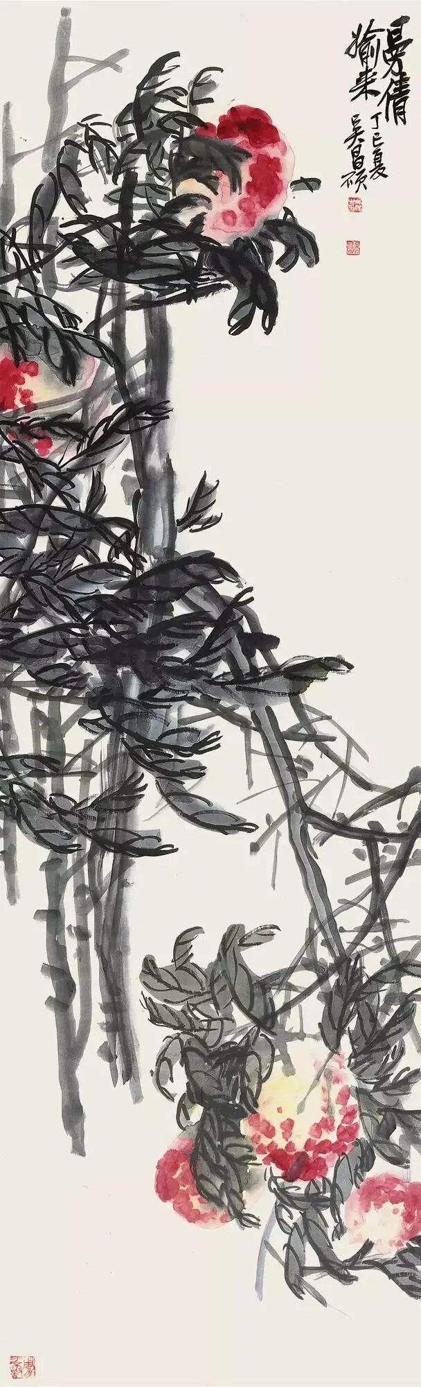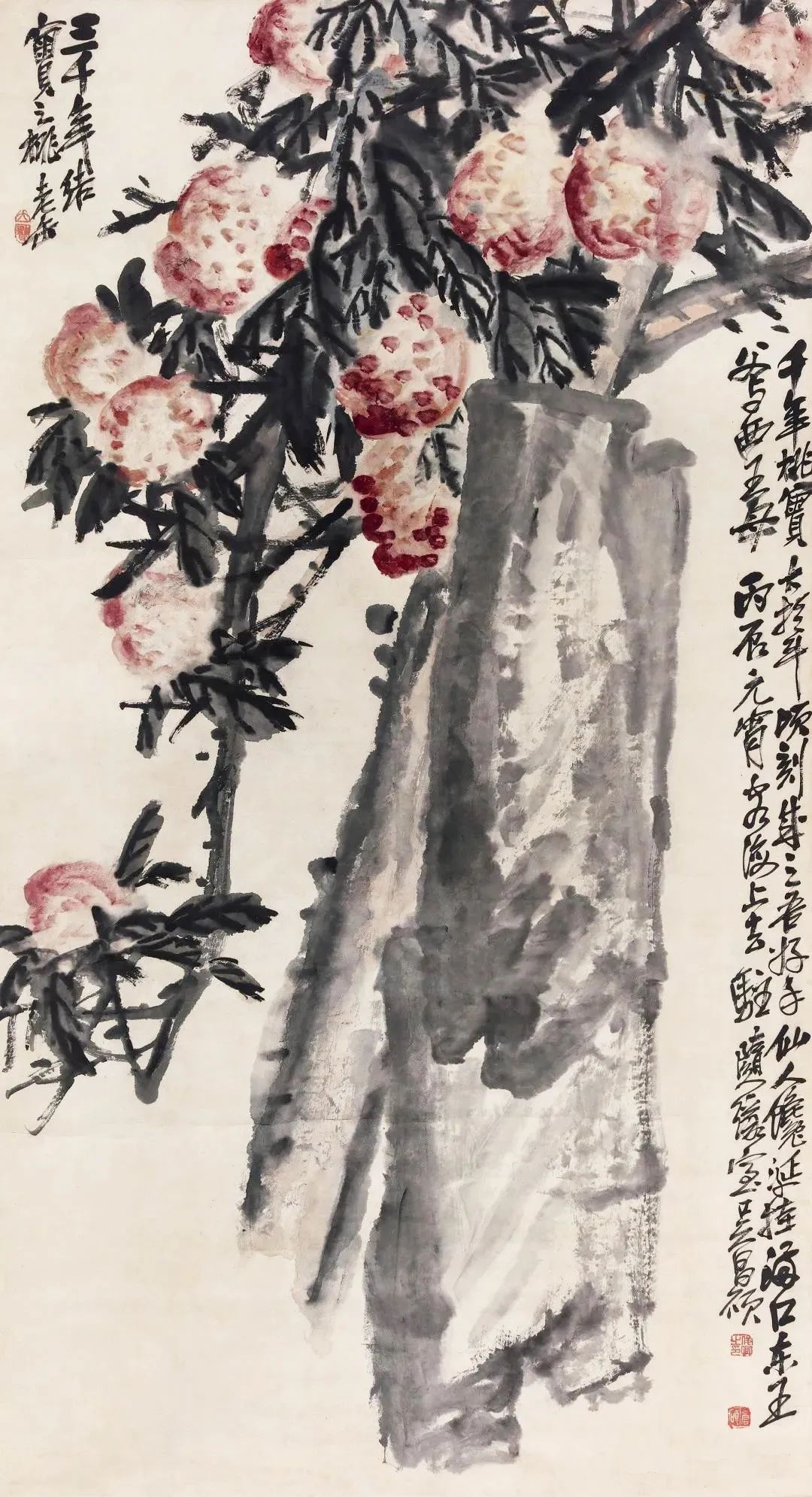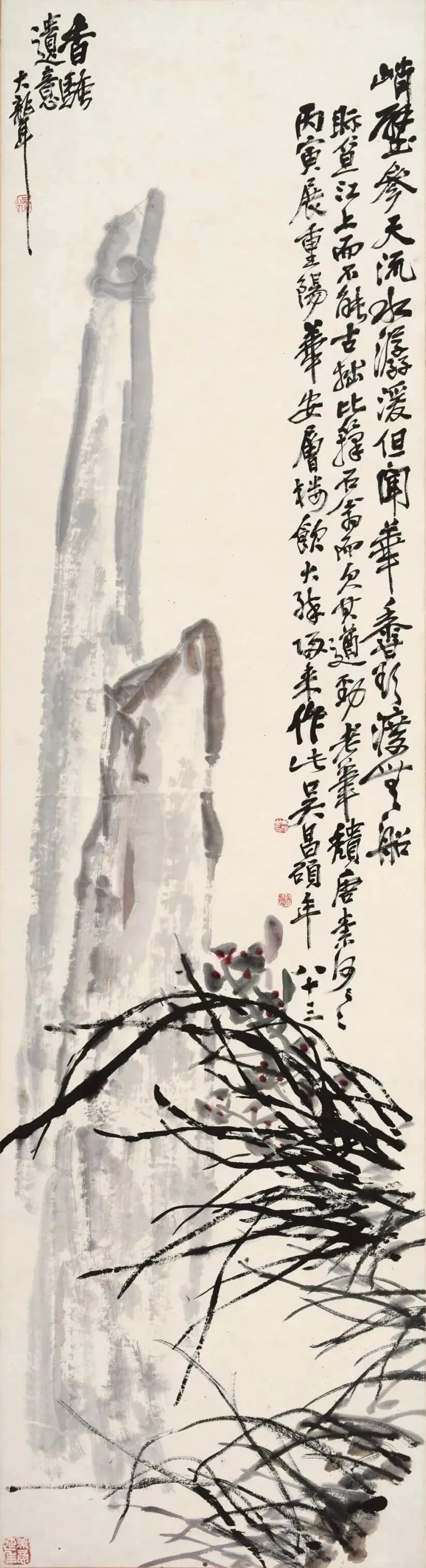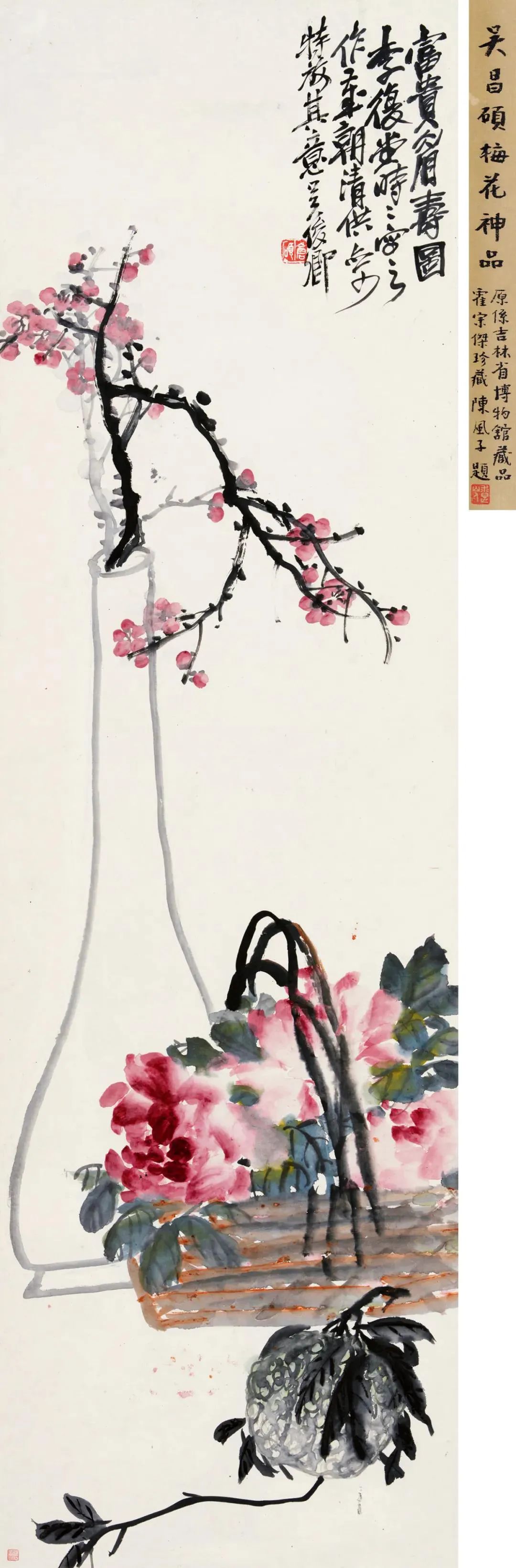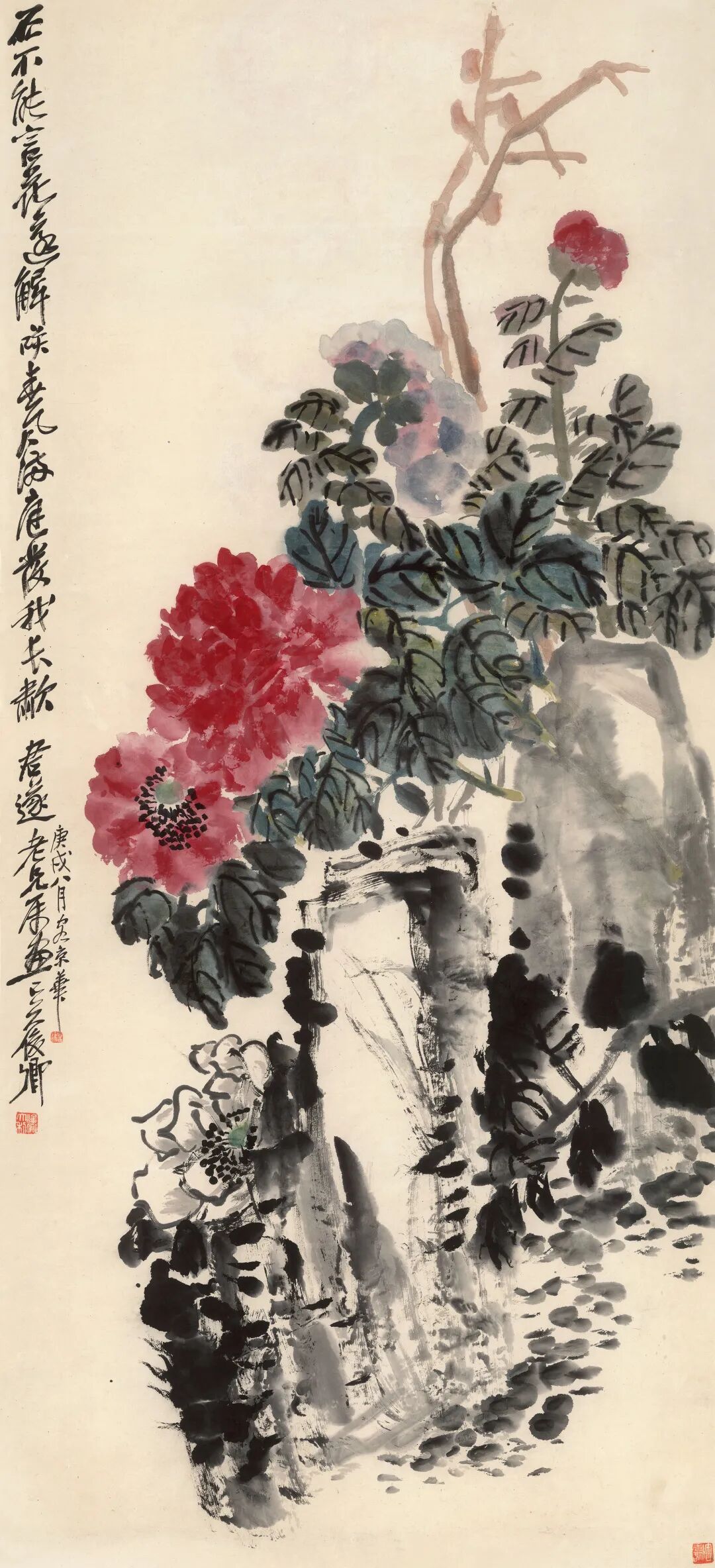 作品集2023-05-27 吴昌硕的花鸟画,笔法老辣! 吴昌硕 茅檐风色 此《茅檐风色》缶翁以熔篆草于一炉的老辣笔法入画,藤蔓错杂纠缠如龙蛇疾走,完全是在书写的状态中完成,配合着墨与色的枯湿浓淡,一气呵成。 吴昌硕 篱菊图 此幅《篱菊图》,用笔老辣,设色俏丽鲜艳,两相互补,相得益彰,可谓神品。 吴昌硕 真龙 这幅《真龙》将严谨感与率意性结合起来,融合各种画法,既得徐渭笔意,又不失个人风格,乃为吴昌硕晚年佳作。 吴昌硕 珊瑚枝 此幅《珊瑚枝》画于1924年,此时吴昌硕已81岁高龄。吴昌硕将梅花比喻成“珊瑚枝”来形容他一生,乃是来源于宋代诗人萧德藻《古梅》一诗:“湘妃危立冻蛟背,海月冷挂珊瑚枝。丑怪惊人能妩媚,断魂只有晓寒知。”其一生从默默无名到蜚声内外,恰是“断魂只有晓寒知”。 吴昌硕《荷塘清趣》 题识:避炎曾坐芰荷香,竹缚湖楼水绕墙。荷叶今朝摊纸画,纵难生藕定生凉。乱涂乱抹绝似黄华道人笔意,时在乙卯冬,吴昌硕。 吴昌硕 春风满庭图 这《春风满庭图》创作于1910年,整幅画面笔酣墨饱,天趣横生,花开灿漫,以鲜艳的胭脂红设色,再以茂密的树叶作衬托,愈发生气勃勃。石头的勾勒线条流畅,层次分明,俱足金石味。 吴昌硕《苍柯翠竹》 此作是吴昌硕八十岁所作,画面构图别致,一株苍劲的古柏拔地而起,略呈弓形蜿蜒垂地,老枝或依干欢畅,或含羞沉吟。 整幅画面,开张挺拔,枝干盘虬,柏叶点点,独特的湿笔干皴中彰显气足墨酣,纵横郁勃中透出浓重的篆意,体现出画家卓荦不凡的心胸。 吴昌硕《彩霞笼住海珊瑚》 此幅《彩霞笼住海珊瑚》作于1921年秋,以雁来红、顽石入画,描绘了秋天秋意斓斑之趣,为缶翁晚年精品。 吴昌硕 桃寿千年 题识:千年桃实大于斗,顷刻成之吾好手。仙人馋涎挂满口,东王父与西王母。丙辰元宵,客海上去驻随缘室,吴昌硕。 吴昌硕《杏花春雨江南》 本幅《杏花春雨江南》为吴昌硕赠送叶振家之作,通篇以篆籀笔法入画,色彩清新明快,艳而不俗,整个画面形成点、线、面的有机组合,如同一首有韵律的交响乐,实为缶翁得意之作。 吴昌硕 富贵眉寿图 题识:富贵眉寿图。李复堂时时写之,作岁朝清供亦可特放其意。吴俊卿。 吴昌硕《傲霜》 题识:雨后东篱野色寒,骚人常把菊英餐。朱门酒肉熏天臭,燕赏黄花当牡丹。乙卯岁十一月呵冻写,安吉吴昌硕。 吴昌硕 天竺顽石 天竹,似竹却非竹,其果实红如丹砂,其叶入秋冬便变红色。天竹耐霜雪,经久不落,与“岁寒三友”一样,被视为植物中的“君子”,深受文人墨客青睐。 吴昌硕画天竹,往往诗画一体,更有文人味。将老石与天竹的搭配喻为“昆仑奴子侍红绡”。 吴昌硕 菊石图 题识:荒厓寂莫无俗情,老菊独得秋之清。登高一笑作重九,挹赤城霞餐落英。丁巳春,吴昌硕。 吴昌硕 芍药 题识:昨见朱椒堂,画将离花,兴到髣髴为之。己未春,吴昌硕。 吴昌硕 香骚遗意 题识:峭壁参天,流水潺湲。但闻花香,欲渡无船。视笪江上而不能古拙,比箨石翁而欠其遒劲。老笔颓唐,奈何奈何。丙寅展重阳华安层楼饮大醉,归来作此。吴昌硕,年八十三。香骚遗意。大聋 吴昌硕 枇杷凤仙花 吴昌硕 曼倩媮来 本文来自微信公众号“上海美术观察”(ID:pyyjb123)。大作社经授权转载,该文观点仅代表作者本人,大作社平台仅提供信息存储空间服务。 TAGS: 中国画吴昌硕花鸟画 相关文章Kleoniki Andr…这是大王Day.281获奖作品《2020最佳图书…精选头像|搞怪来袭!安东尼奥·布埃诺 作品配色清新梦幻的场景插画,充…美国Jennifer Mc…【小鹏设计】设计小改/动力…【首发】地点空间丨打破空间…谢商家不坑之恩!只骗有钱人…