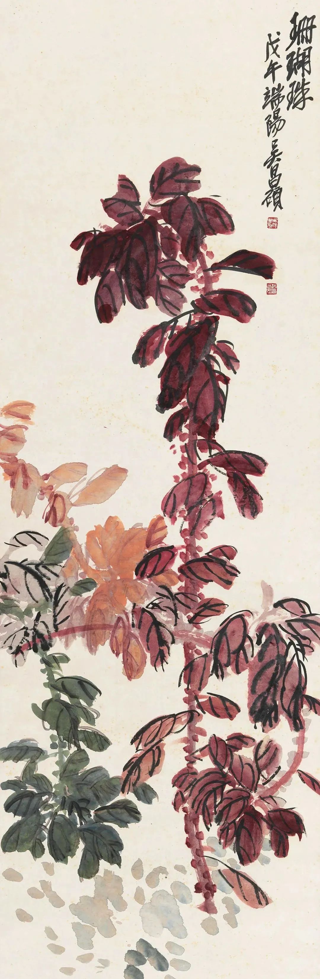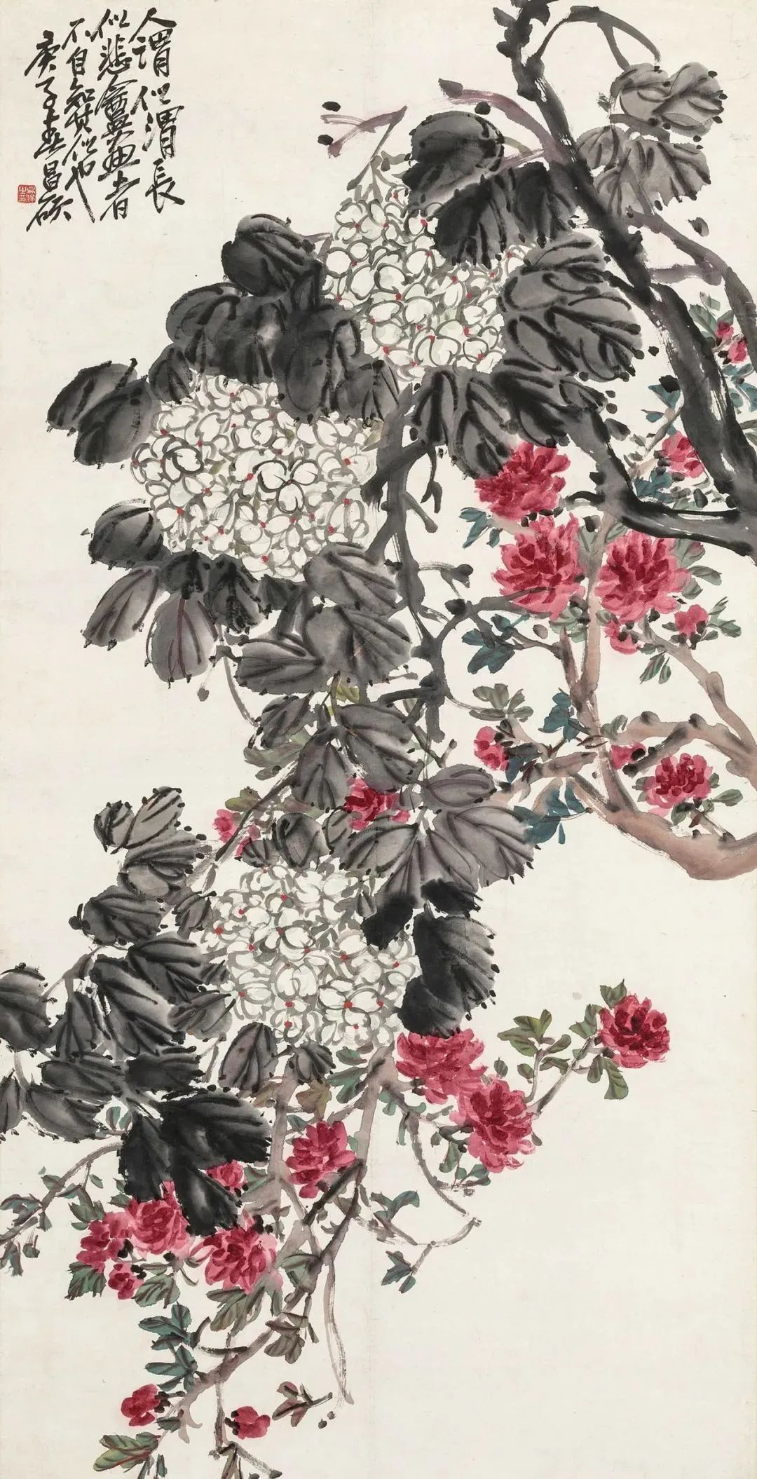 吴昌硕的绘画以气势为主,在画面布局、用笔等方面显得最为突出,不论横幅直幅,所画花木常用对角倾斜之势,梅花、桃花、桂花布局常从下角向上方斜出;画藤茎植物又从上角对向下角,紫藤、葫芦、葡萄,结合笔势,画面产生龙腾蛟舞之气势。