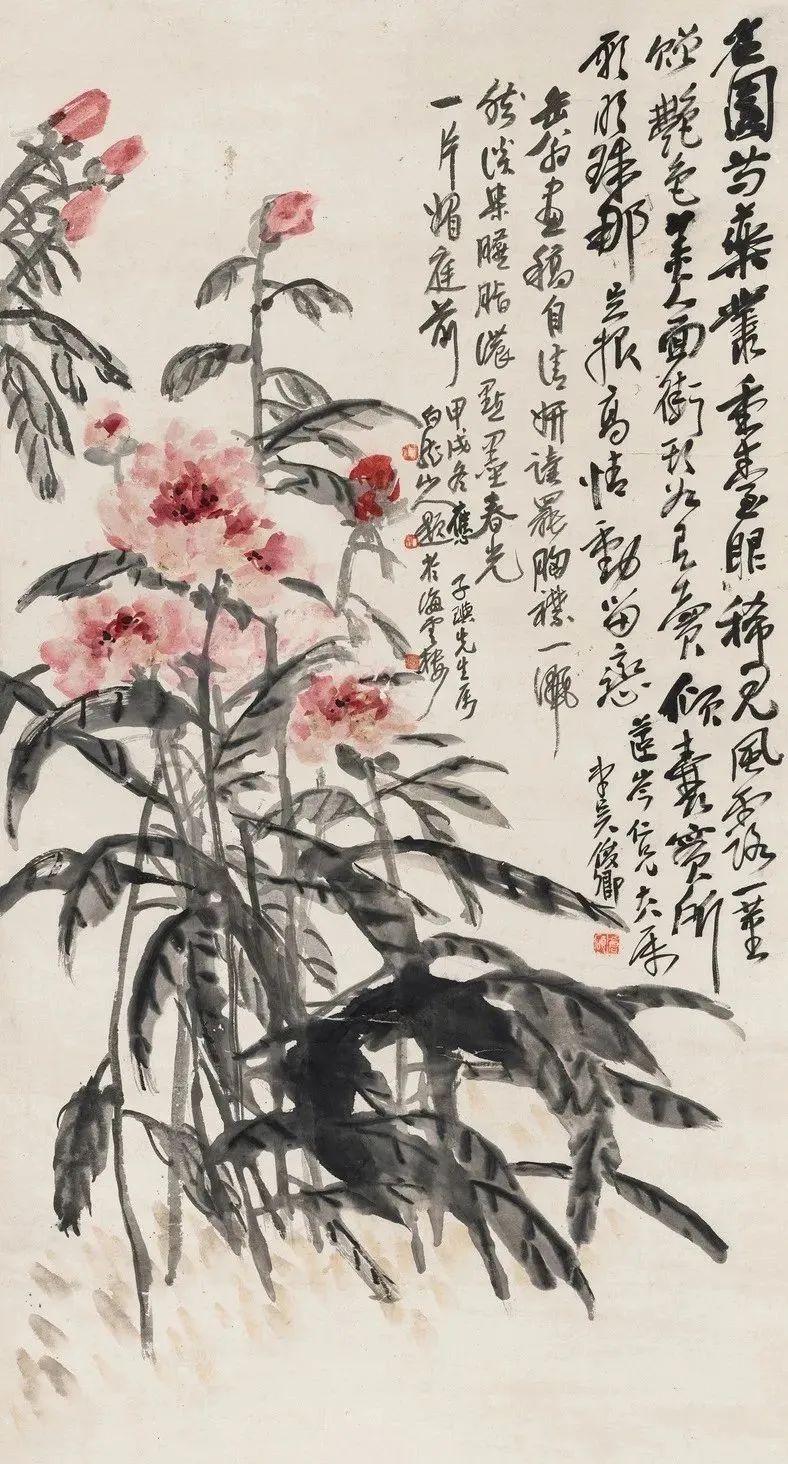 而画花卉,常配以怪丑奇石,极尽穿插之妙,不经意中颇具匠心,以气取势,因势传神,横涂竖抹,苍劲雄浑,貌拙气酣,以极简练的笔墨表现出深邃的意境。