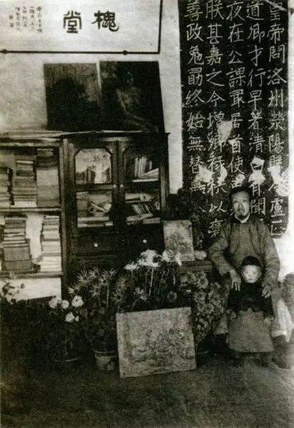 图为陈师曾与其子在家中合影,桌前花卉油画据考证系李叔同早期作品,亲自赠予陈师曾收藏