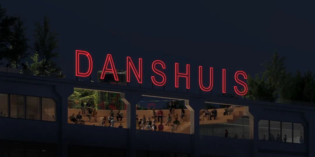 在建筑顶层,MAD设计了一个朝向默兹河的露天剧场。夜幕中沿河的红色霓虹灯亮起,舞者以河畔瞬息万变的景色为背景起舞,描绘出戏剧性的当代图景。