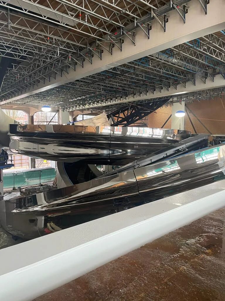 二层景观露台加入隐喻着港口移民历史的艺术装置黄色海鸥雕塑。海鸥轻盈伫立,与Fenix移民美术馆盘旋上升的银色楼梯,共同表达“流动”“多元”的主题。