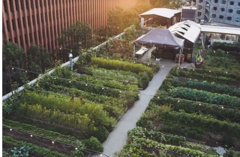 人们置身在楼顶花园,