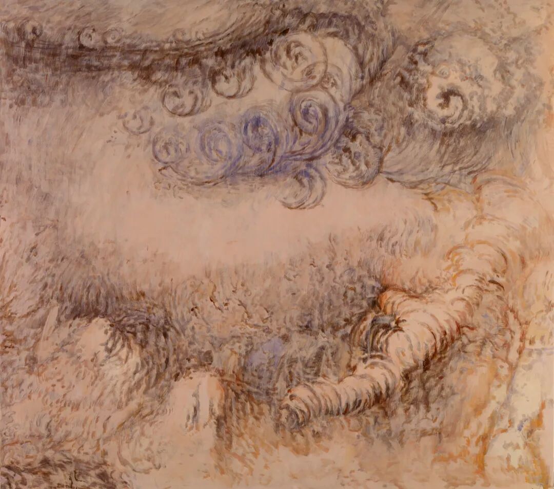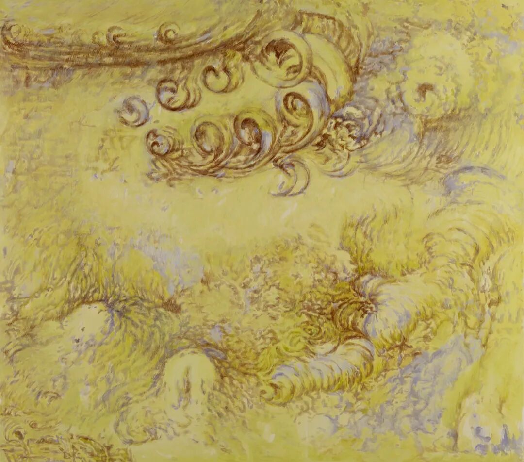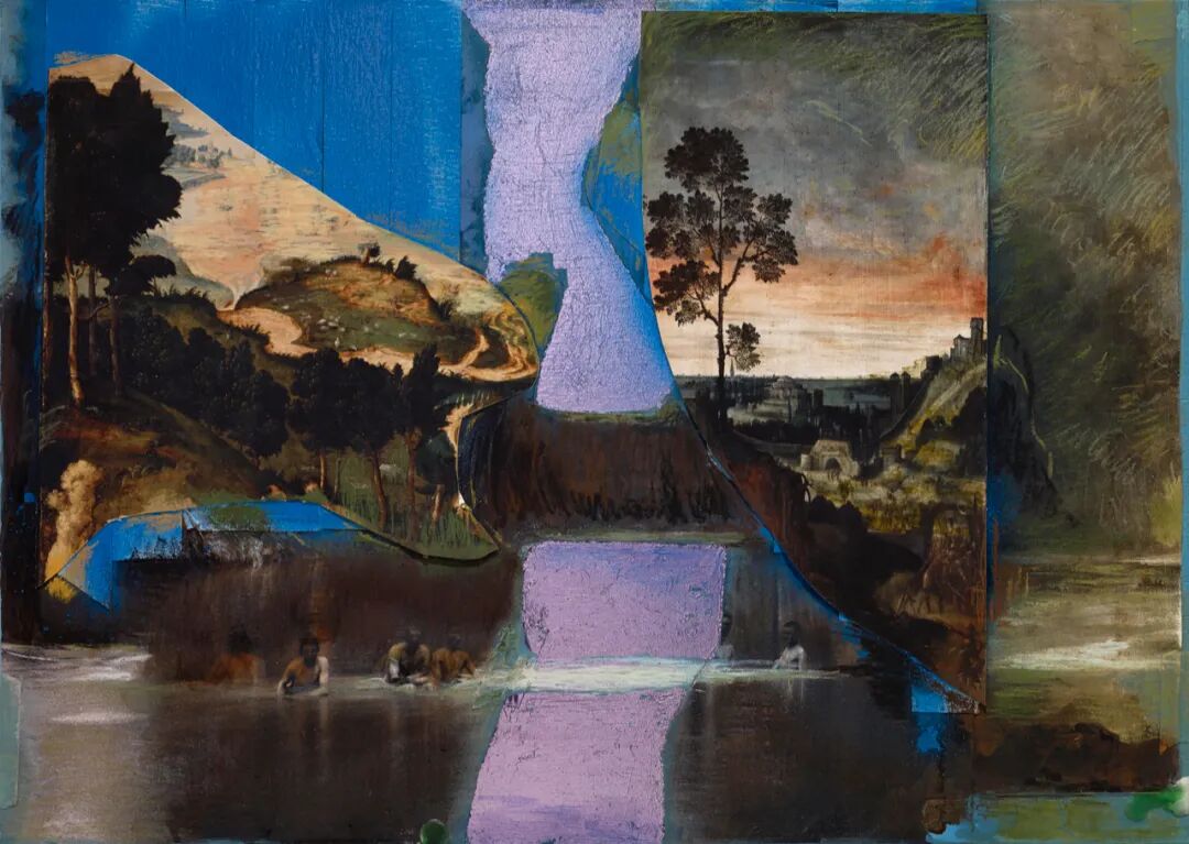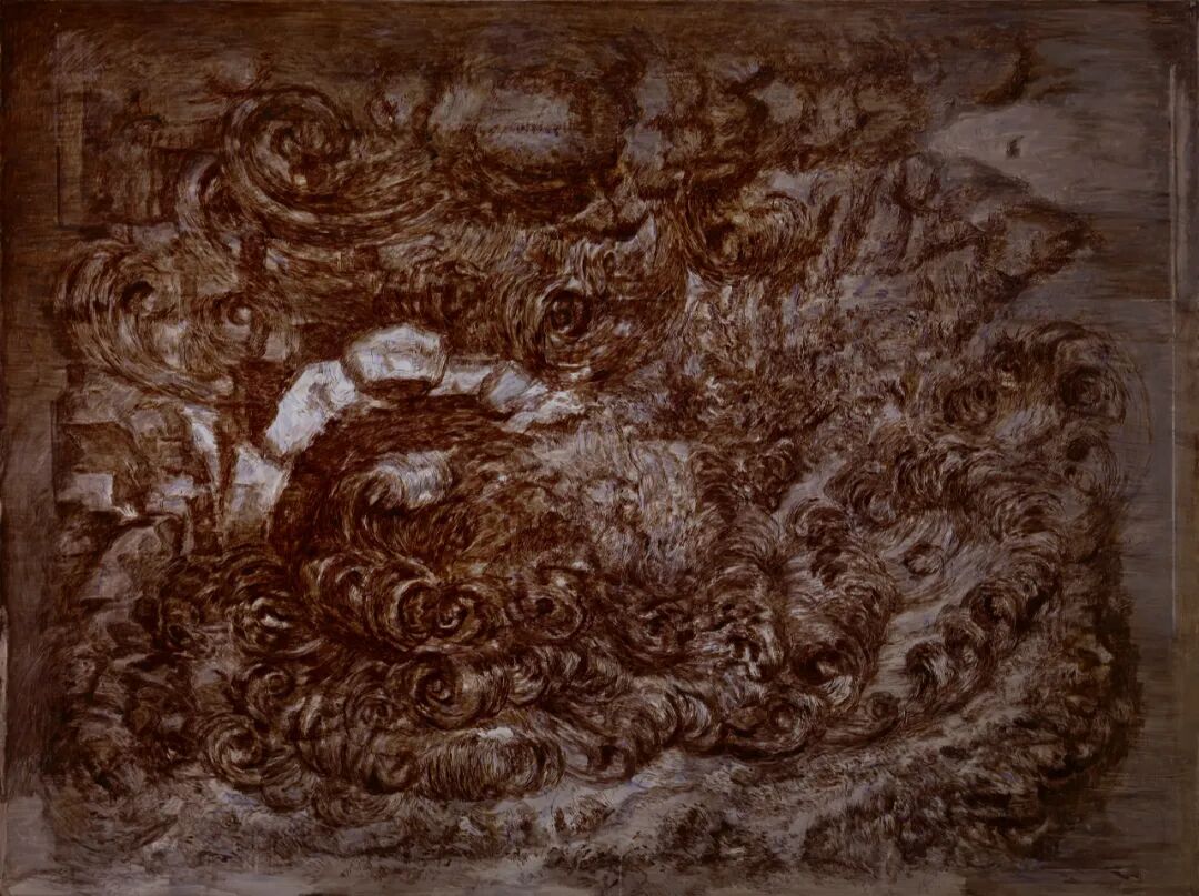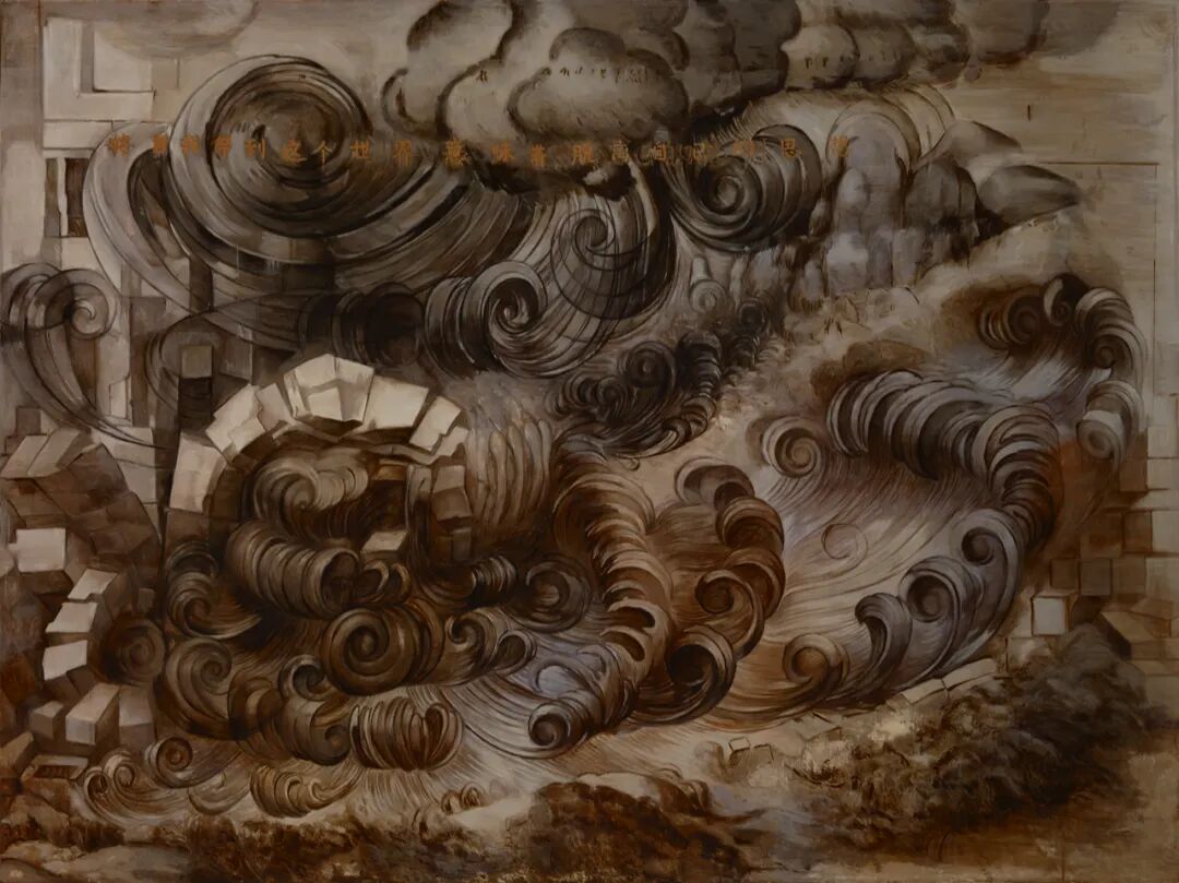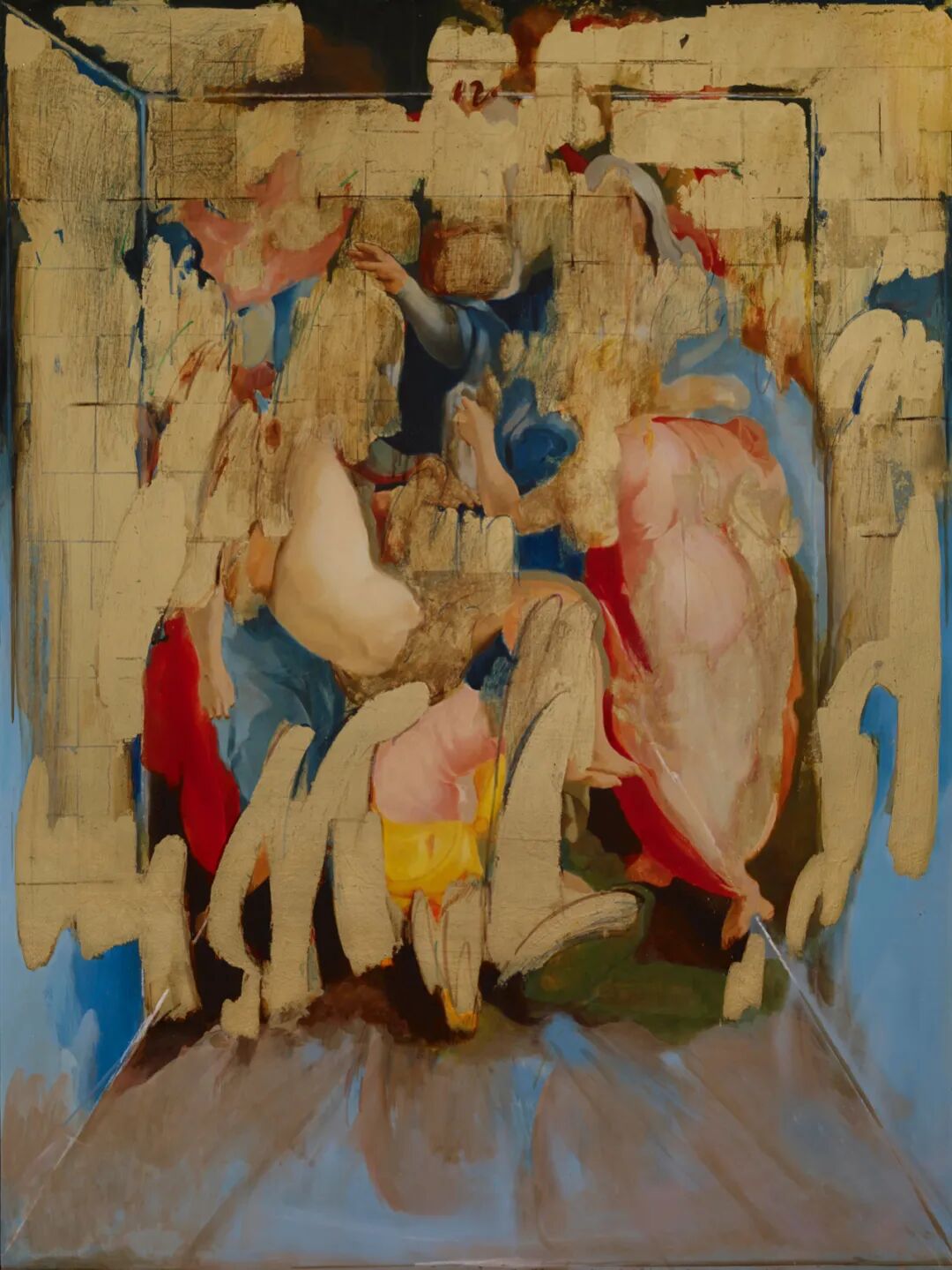 罗曼蒂克的语言1,木板石墨、油画、炭笔、铅笔、粉笔、银箔,220 × 165 厘米,2018