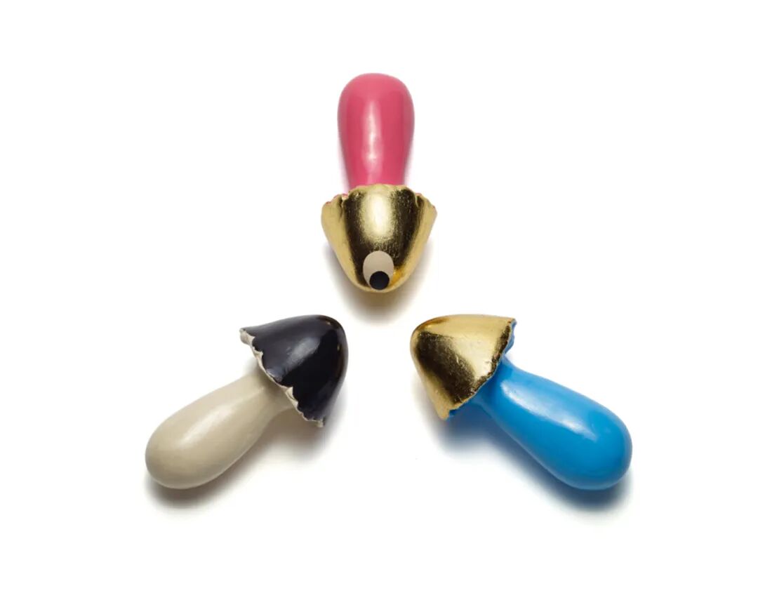 蘑菇,石塑粘土、金箔、丙烯,粉色16x8cm、蓝色17x9cm、白色15x9cm,2020