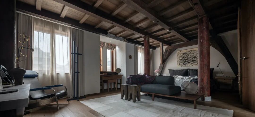 客厅用了4根30公分见方的楠木立柱,卧室的天花用了4根7米长的楠木主梁,这样的老料现在很难找到了。我基本上都没有进行过多的加工,时光的印记,和曾经工匠的痕迹都完整地保留在上面。