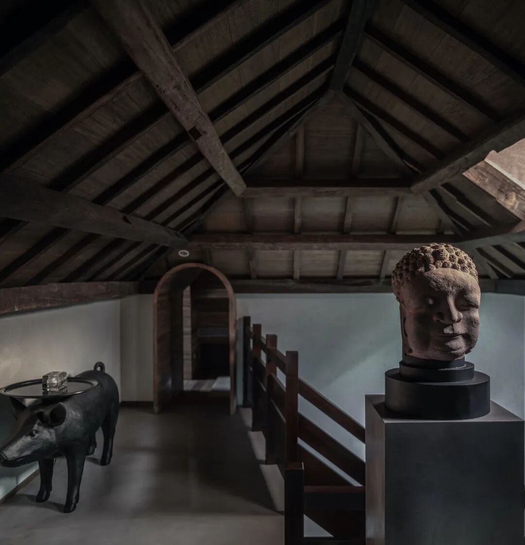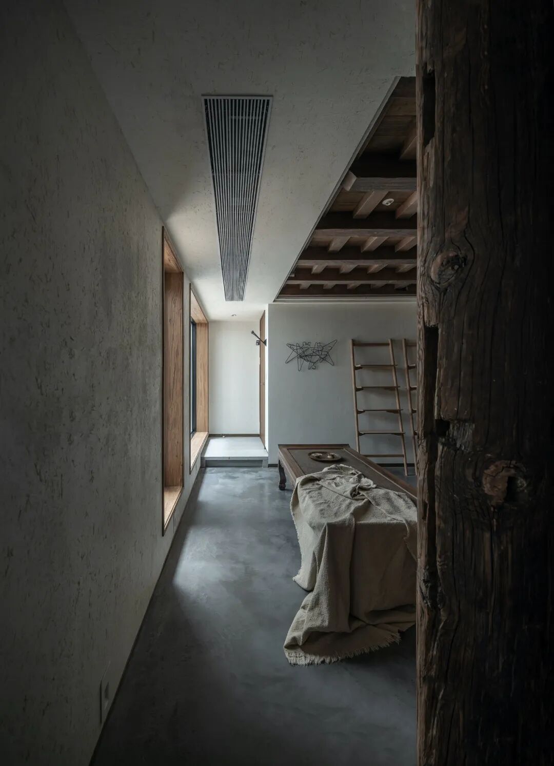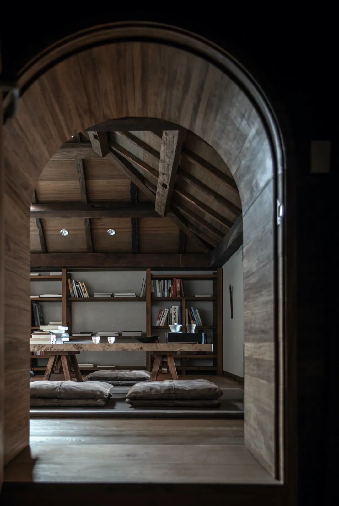 顺着木质护栏的楼梯一直向上,来到用木头搭出的阁楼,推开一扇小门,一处极静的禅修洞,仿佛来到了某个深山中隐世的木屋。