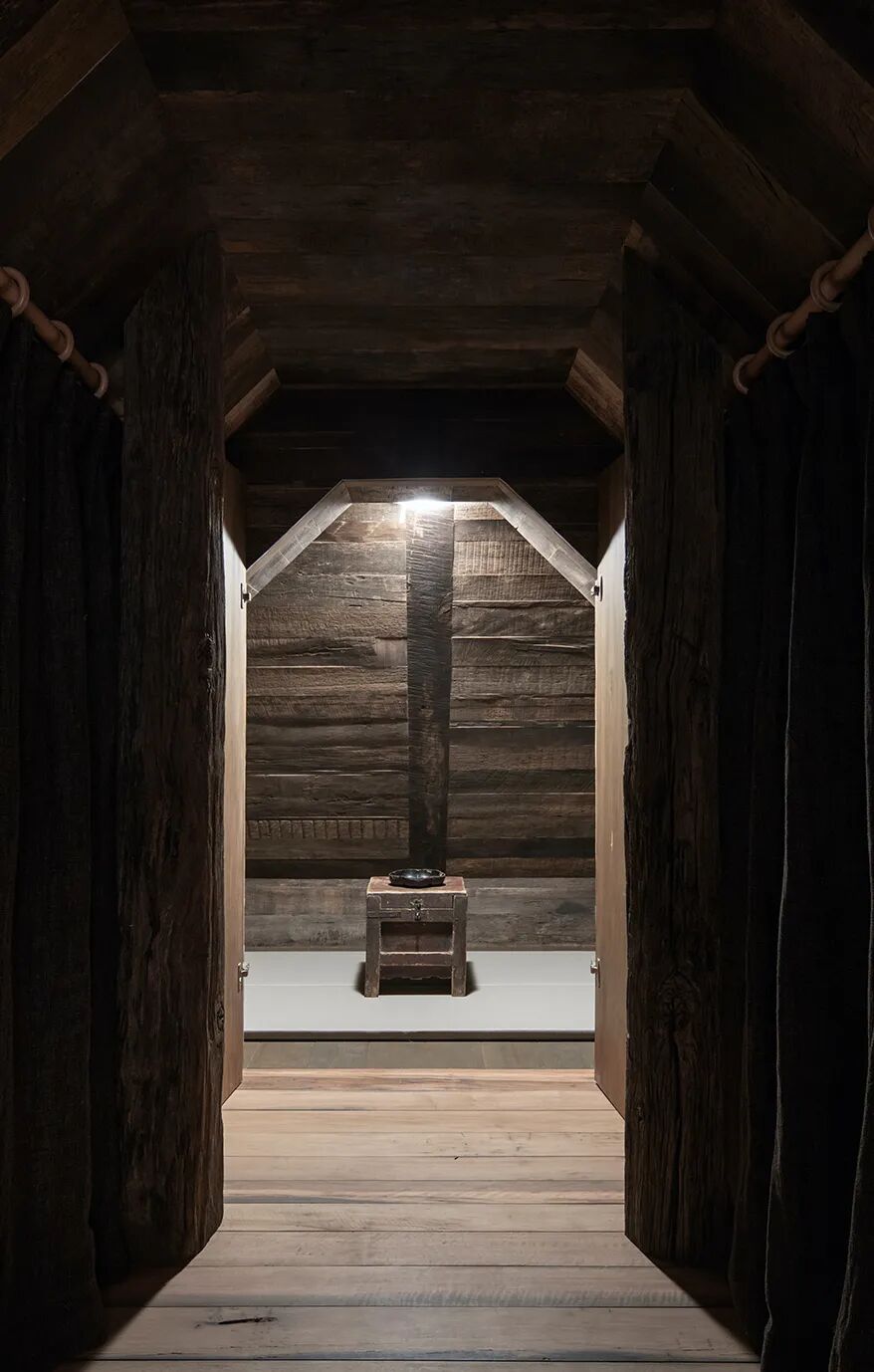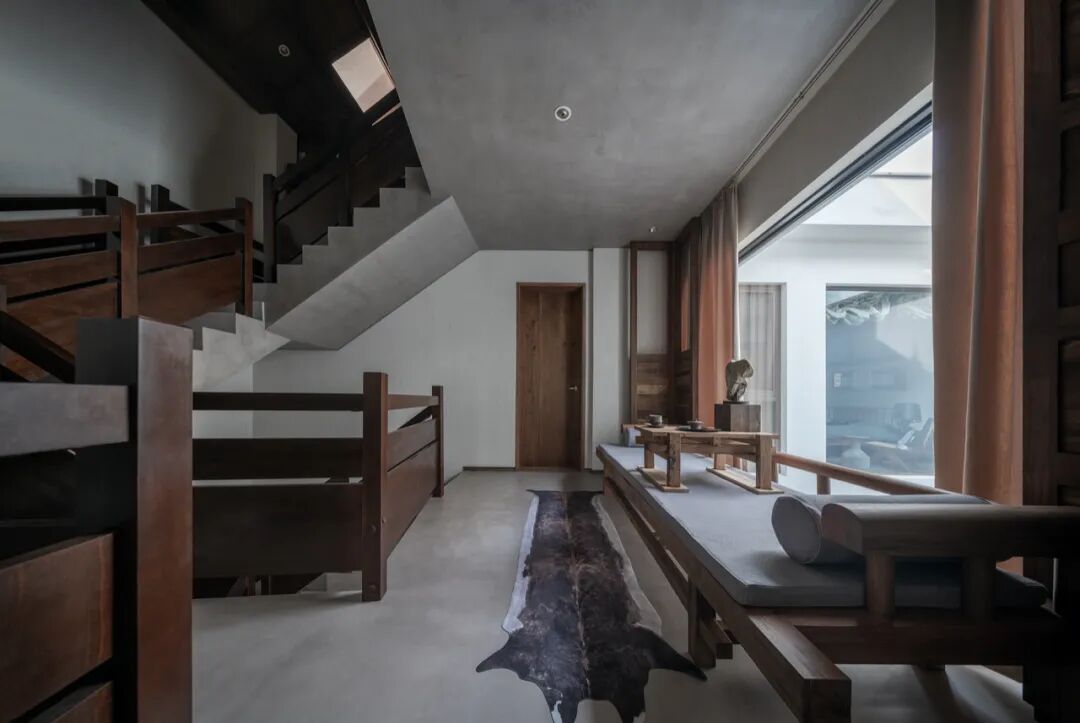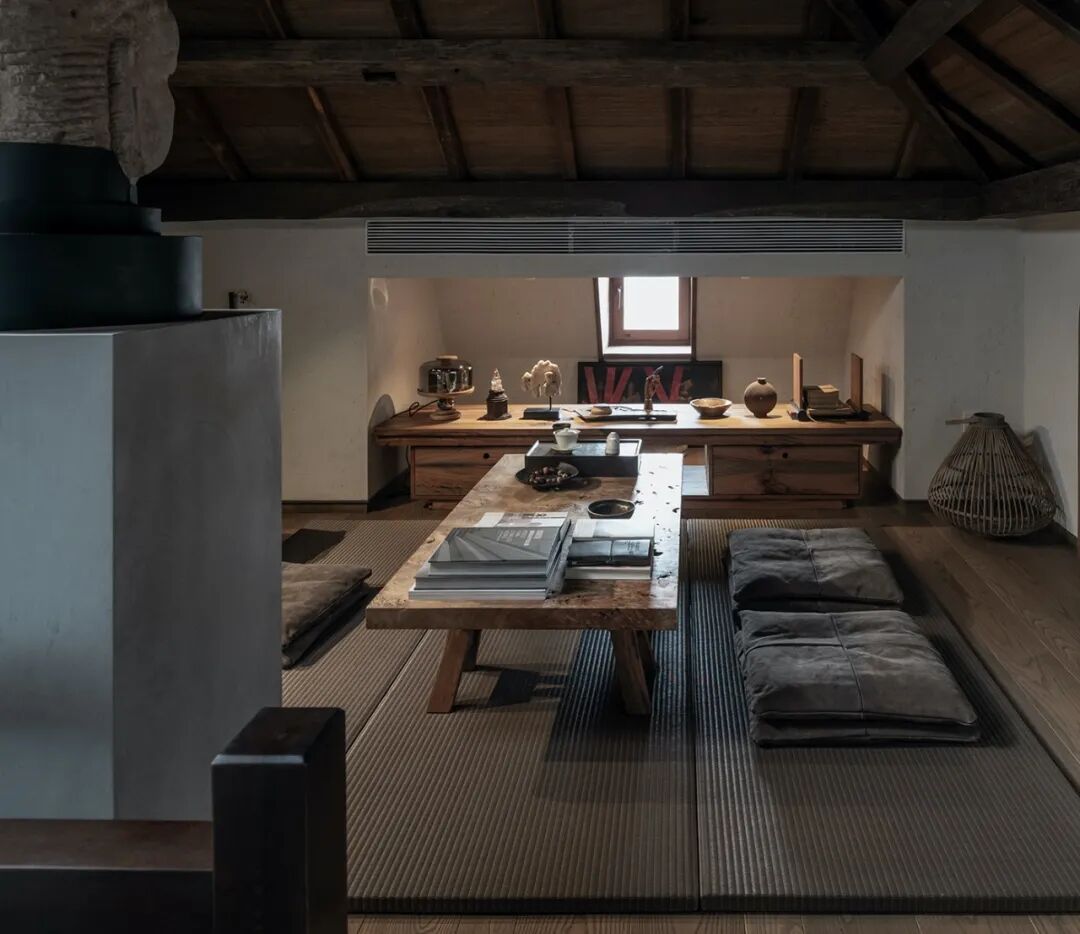 顺着木质护栏的楼梯一直向上,来到用木头搭出的阁楼,推开一扇小门,一处极静的禅修洞,仿佛来到了某个深山中隐世的木屋。