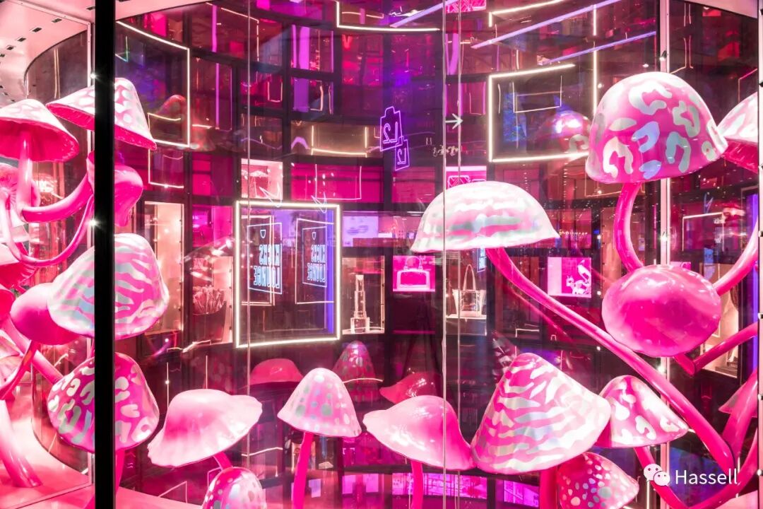 粉色饰品场馆的布置如同博物馆一般,展示的物品由下向上陈列至镜面天花,让顾客仿佛踏入了无限空间。