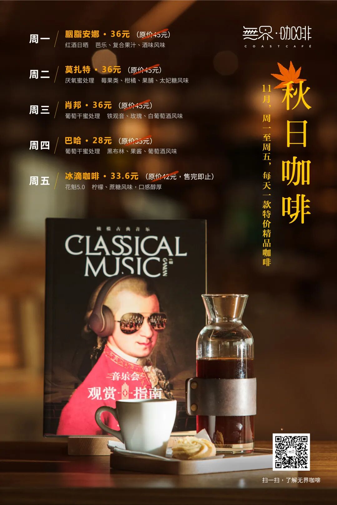 这个秋天,无界咖啡特意从周一到周五,带来5款风味各异的精品咖啡,并以更优惠的价格为秋天丰富的味道添一些暖,等待与你我相逢在秋日。