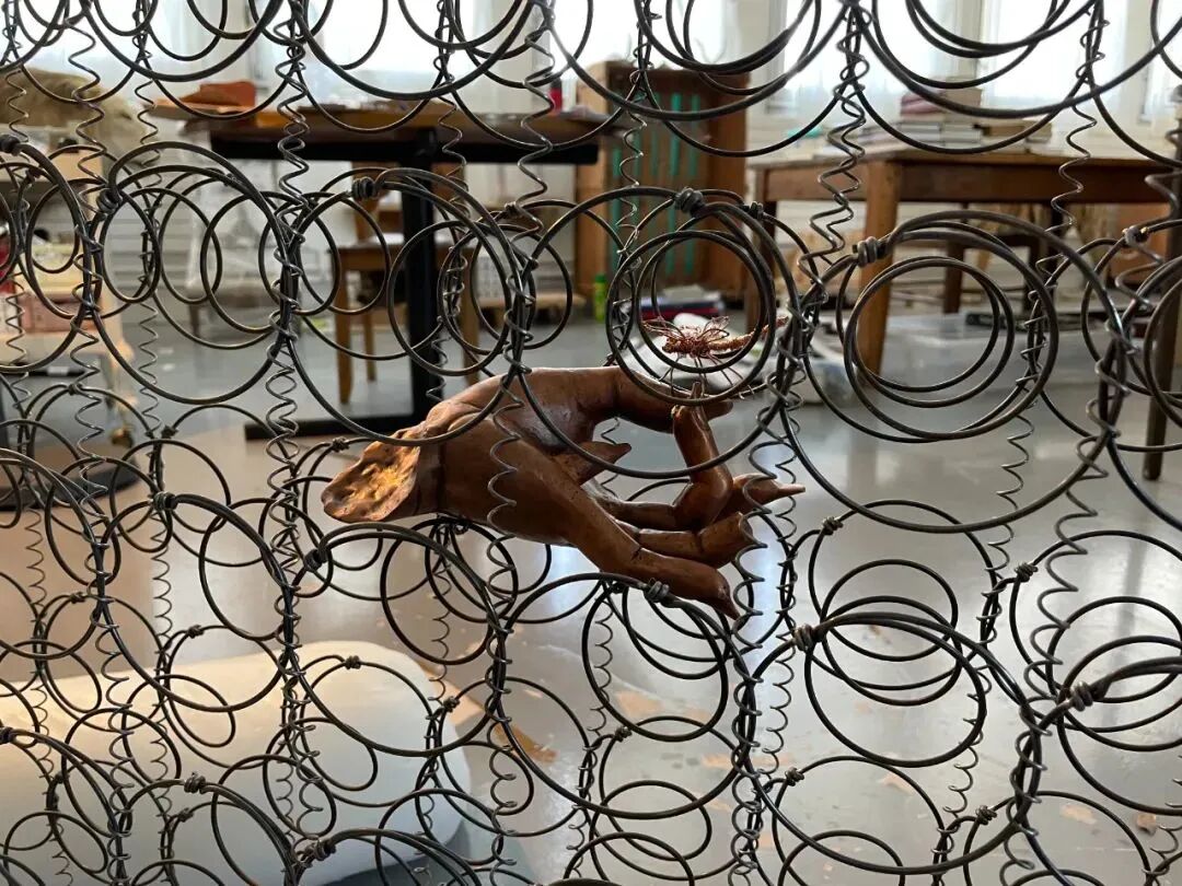 《Gazelles,1990-2020》题目来自法国普罗旺斯一个学生宿舍的名字,是沈远1990年初到法国后和黄永砅在一起的第一个落脚点。作品以蜡为材料翻制了一个双人枕头,它的一边架起一个单人席梦思床垫的内心弹簧构架,中心部位安置了一个铜皮打制的女性的手,手上停落着一只铜丝编制的蜻蜓,在其周边也有几只蜻蜒围绕穿梭。这件作品叙说了一段往日的故事,也表现了天地人间那隔时空的神秘感应......
