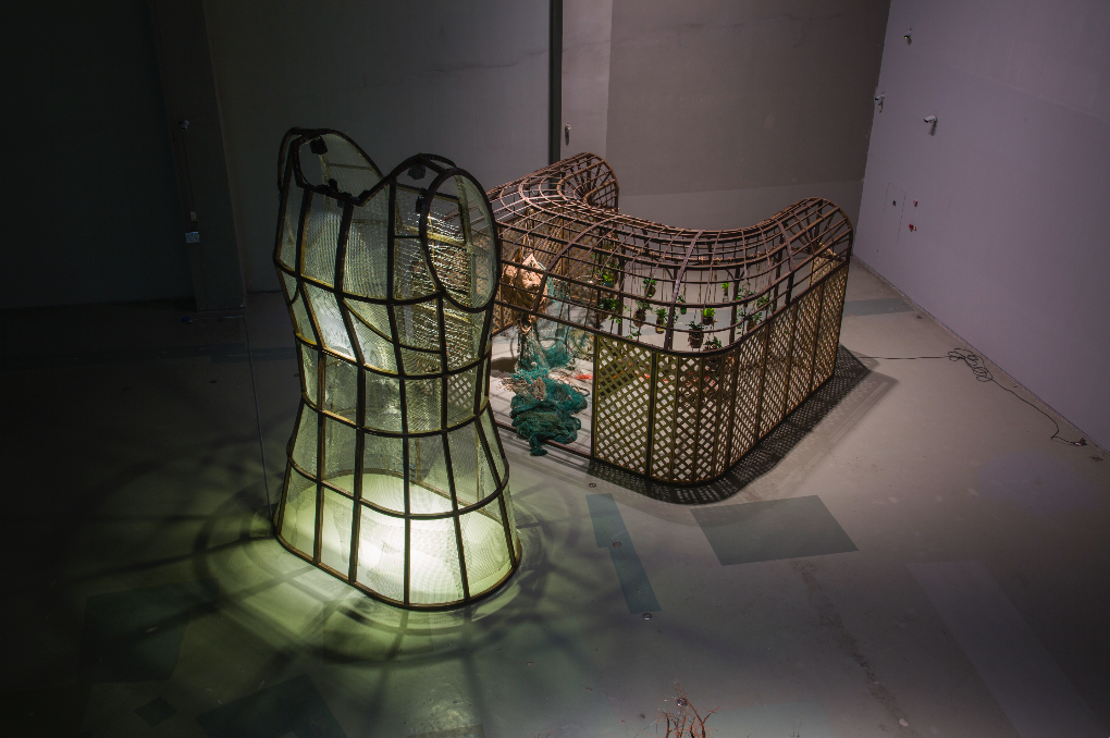 创作于2017年的作品《阴性花园》,以女性的束身衣为造型,艺术家将其一裁为二,束身衣的上半身是一个封闭的空间,下半段是一个类似于花园的空间,观众可穿梭其中。紧身胸衣网状结构的柔软而精细的线料被坚硬的钢丝所取代,将女人的身体束缚起来……然而,大自然的生命拒绝被工业化、男性化的材料和结构所排斥,从其内部野蛮生长,形成一个活力充沛的花园,花园里还有一个喷泉——不仅是对农耕时代的呼唤,也是“女性”活力的呐喊。