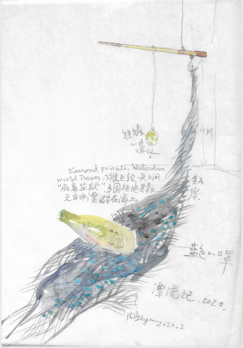 《漂流记,2020》呈现三艘游轮(世界梦号、钻石公主号和威斯特丹号)的事件。由于covid-19的传播而导致成千上万的乘客被关在海上数周,多少人环球旅行的梦想变成了噩梦,人与人之间关系也随之改变——恐惧与拒绝,人生之旅也可随时改变方向。我们不禁要问:漂流——游牧主义,或漫无目的的游荡,是面对我们这个时代的唯一出路吗?