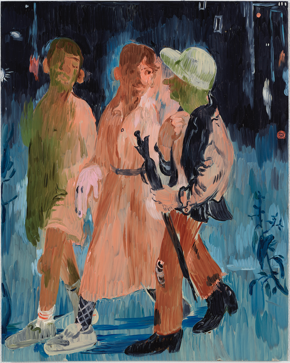 本次展览的中央展厅以“夜”为线索串联起空间内的作品。夜晚的场景成为了酷儿群体获得庇护且充满了渴望、振奋和愉悦之情的潜在空间。《夜晚的公园》(2022)中低垂、扭曲的树木呼应了艺术家画笔下阴柔的人物形体和姿态,并以其代表性的绿色调被呈现于画布上——微妙的色调变化使绿色展现出平和、葱茏而又危险、毒烈的丰富意涵。