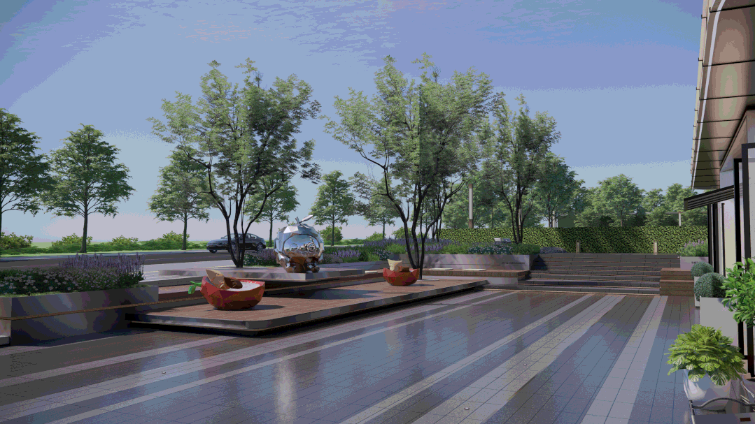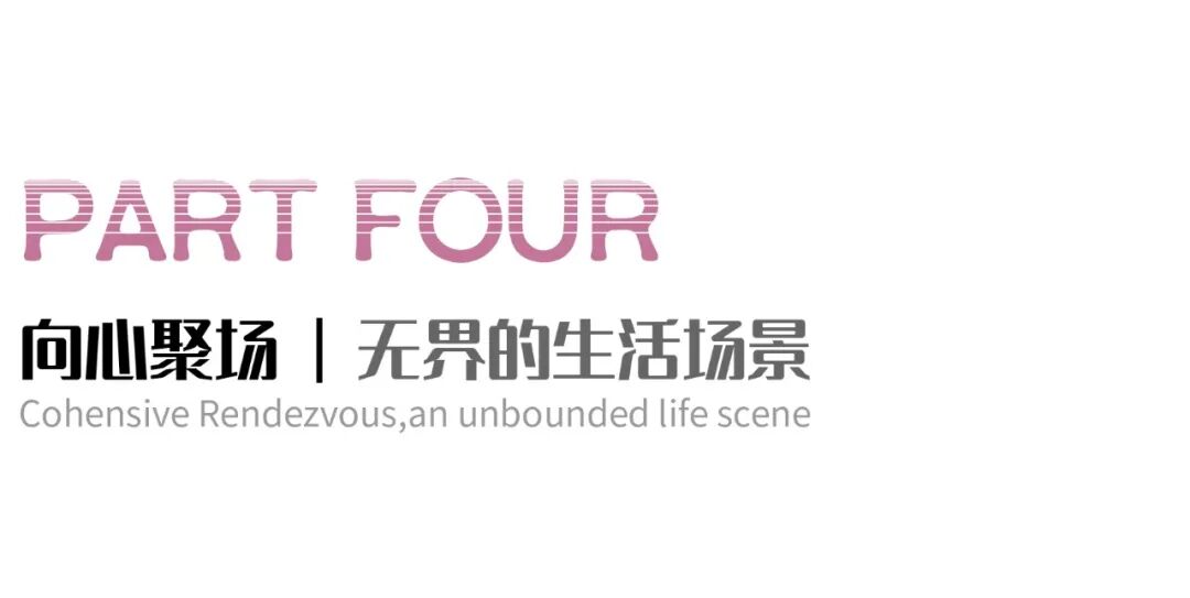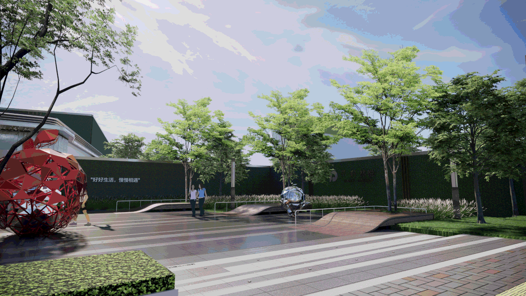 该项目最核心的景观场地,便是售楼处前的临街界面。因为市政道路最高处比场地高1.2米,天然形成了向心空间,我们以向心剧场为理念,形成了中央为多功能生活广场,周边是看台,可为周边居民提供一块家人们共同嬉戏欢愉的空间。在生活广场,日常,它是大人小孩可以共同玩耍的旱喷广场,周末,它是热闹纷呈的集市空间。