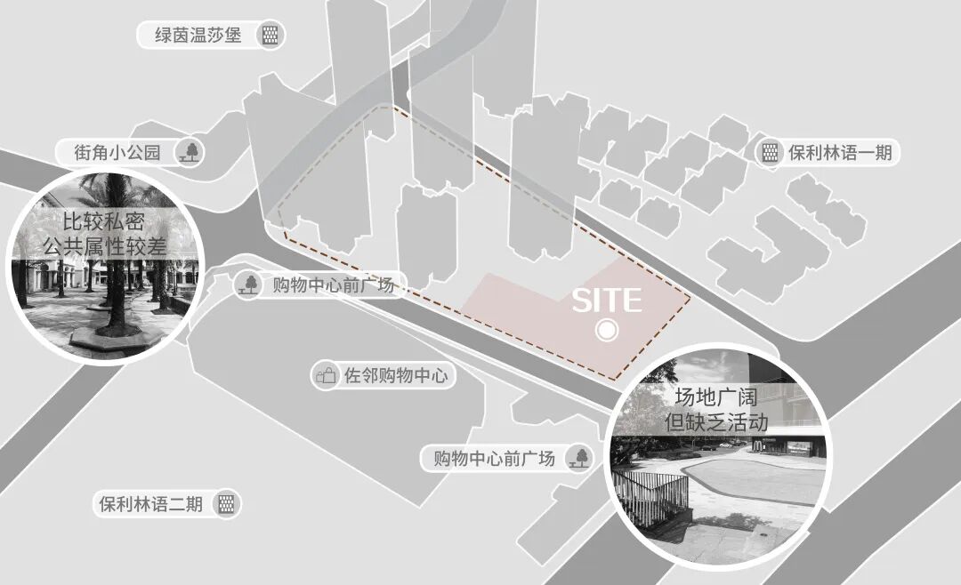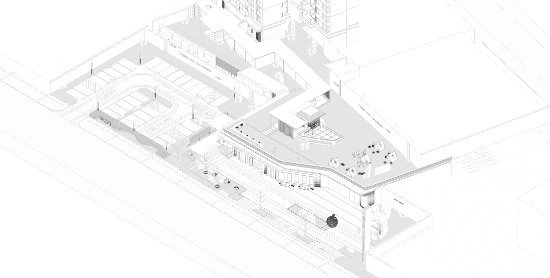 项目位于东莞市樟木头镇,“烟火气”是场地周边环境给人的第一感受,因为周边有成熟的住宅区和大型商业。我们5000m²左右的售楼处嵌合其中,然而,即便是如此成熟的综合居住片区,能提供给周边居民活动的公共空间却非常有限