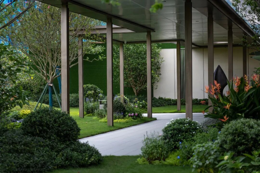 来到样板房的庭院空间,穿过舒适的花境游廊,缓缓步入样板间。