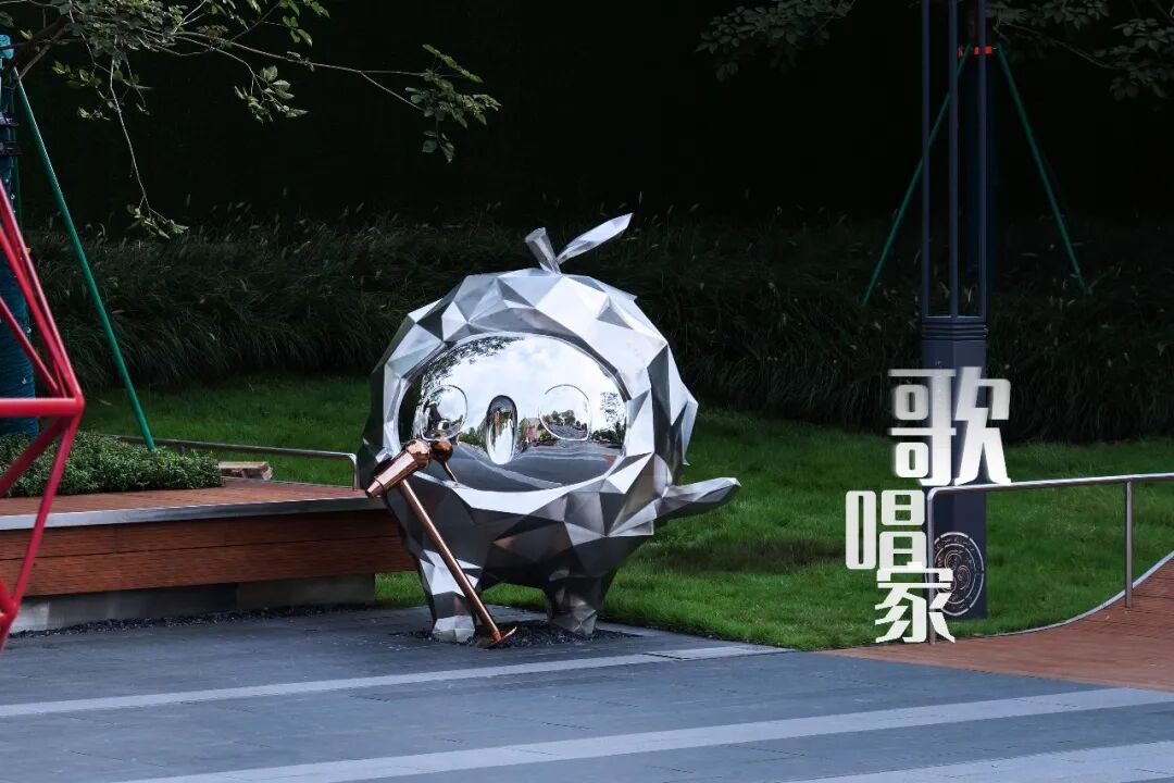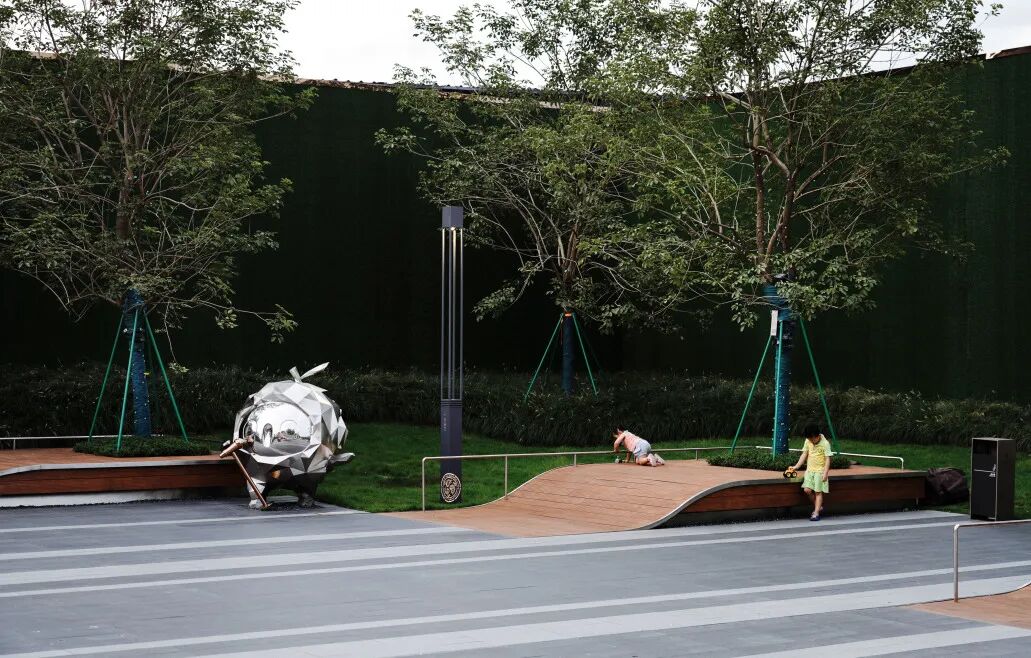 生活剧场东侧的场地,既是看台空间,也作为一个单独的口袋空间,设计师期待将城市路演等更能激发场地活力的功能融入其中。在这里,我们设计了一个可以WiFi扫码连接的户外荔枝小音箱,连上wifi,就可以开启一场说唱就唱的城市路演。两侧的创意家居,曲线的造型设计如滑梯般存在,很多儿童游玩其中。