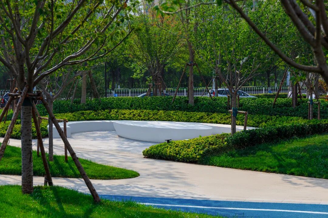 灵动的树影与白色石凳勾勒出轻松纯粹的愉悦氛围