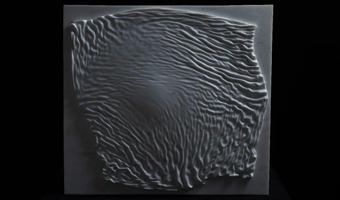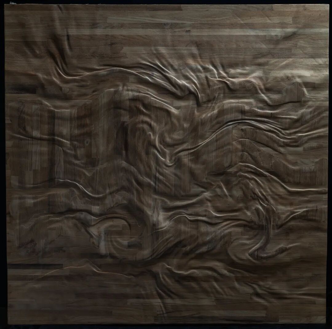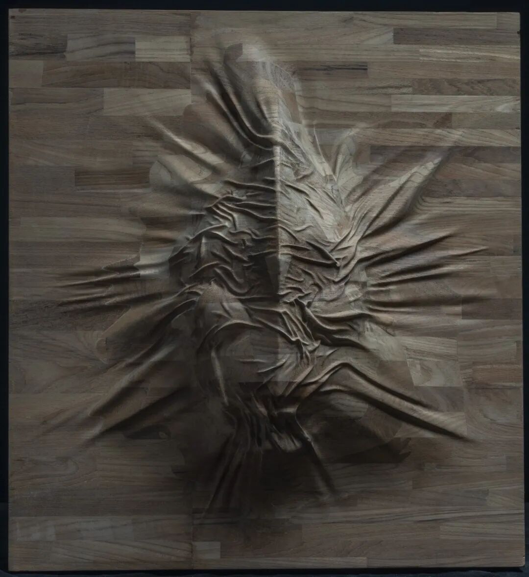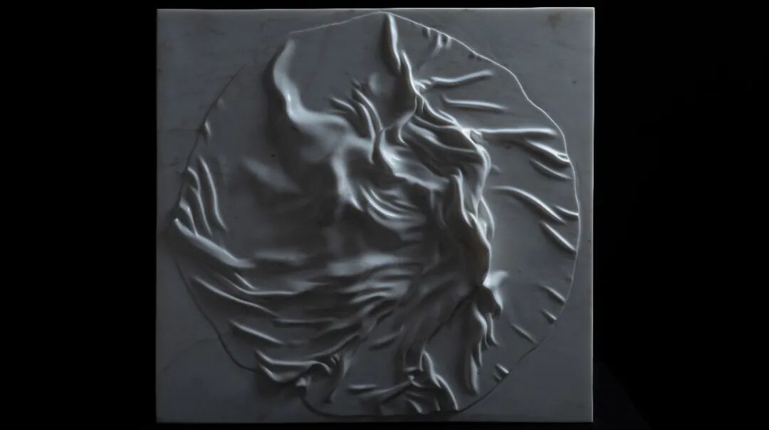 《Where is your hero?》系列以同样的手法,将黑色花岗岩、檀木、大理石等坚硬的材料雕刻成柔软的丝绸,其下是肃穆的面孔、蜷缩的人体、英雄符号、头盔、婴儿等形象,似乎在等待被人揭开,一窥真相。