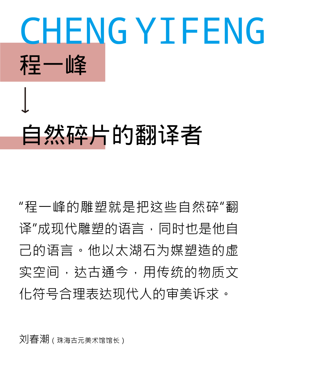 作为国内较少有的、一直专注于抽象雕塑创作的艺术家,程一峰追求对形态与空间进行自由表现,因此他将沙石、水滴、落木这些自然碎片聚合、碰撞、融合成为饱含情感的形体与符号,将自然景观缩影和简化为纯粹的精神和美学体验。